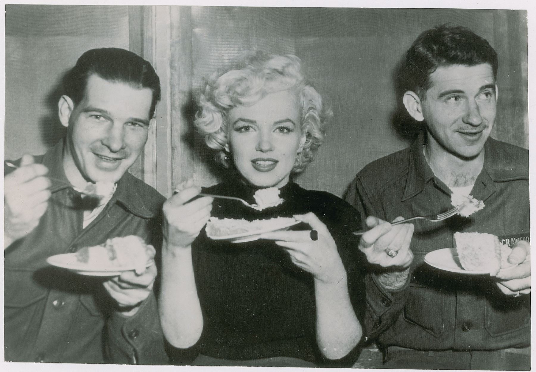Original vintage glossy 8.25 x 5.75 silver gelatin photo of Marilyn Monroe eating cheesecake with two American servicemen during her 1954 entertainment tour of Korea. Reverse bears International News Photos and King Features Syndicate credit stamps, as well as a typed caption (no longer affixed). In very good to fine condition, with trimmed edges, and scattered light creasing.