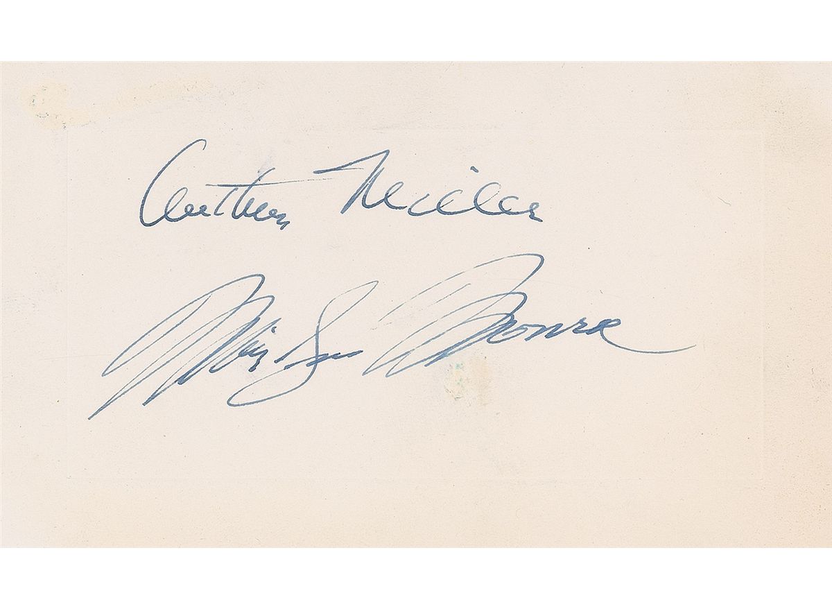 Vintage fountain pen signatures, “Arthur Miller,” and “Marilyn Monroe,” on a 5.75 x 3.5 double-weight custom-made collector's card (similar in look to an invitation card). Card is notated on the reverse by the collector, “Marilyn Monroe—Arthur Miller NYC 1/58.” In fine condition, with a couple small areas of trivial surface loss, one directly under Monroe’s signature. Monroe and Miller first met in Hollywood in 1950, and were married from 1956–1961, separating shortly after Monroe completed filming The Misfits, written by Miller. A spectacular set of signatures, and the nicest dual-signed item from this early Hollywood power couple we have offered.