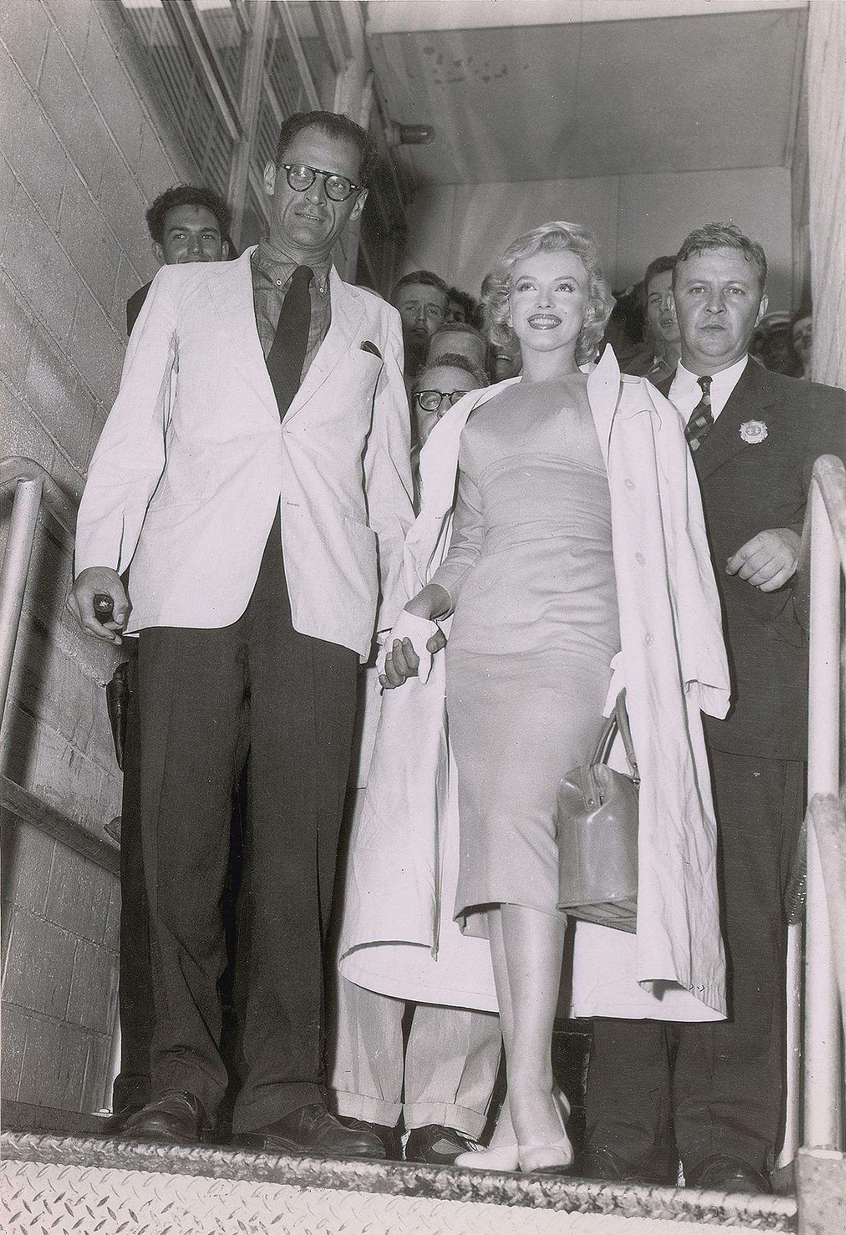Original vintage glossy 6.5 x 9.75 silver gelatin photo of Marilyn Monroe and husband Arthur Miller at the airport on July 13, 1956, leaving New York for London. Reverse bears a "Movie Life" stamp. In fine condition, with trimmed edges.