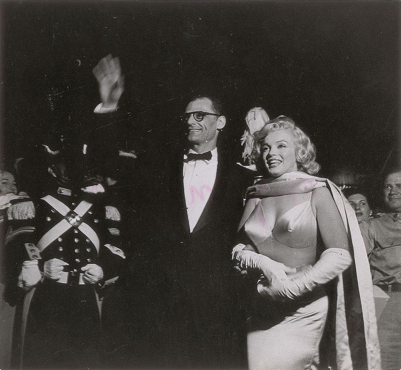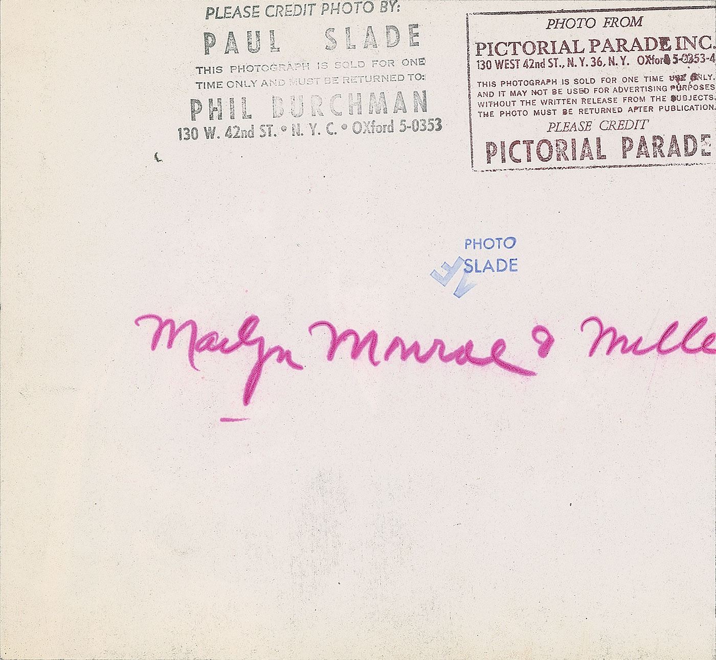 Wonderful original vintage glossy 7.75 x 7.25 silver gelatin photo of Marilyn Monroe and Arthur Miller walking together in elegant formal attire. Reverse bears Paul Slade/Phil Burchman and Pictorial Parade credit stamps. In fine condition, with trimmed edges and slight show-through from a magenta annotation to the reverse.