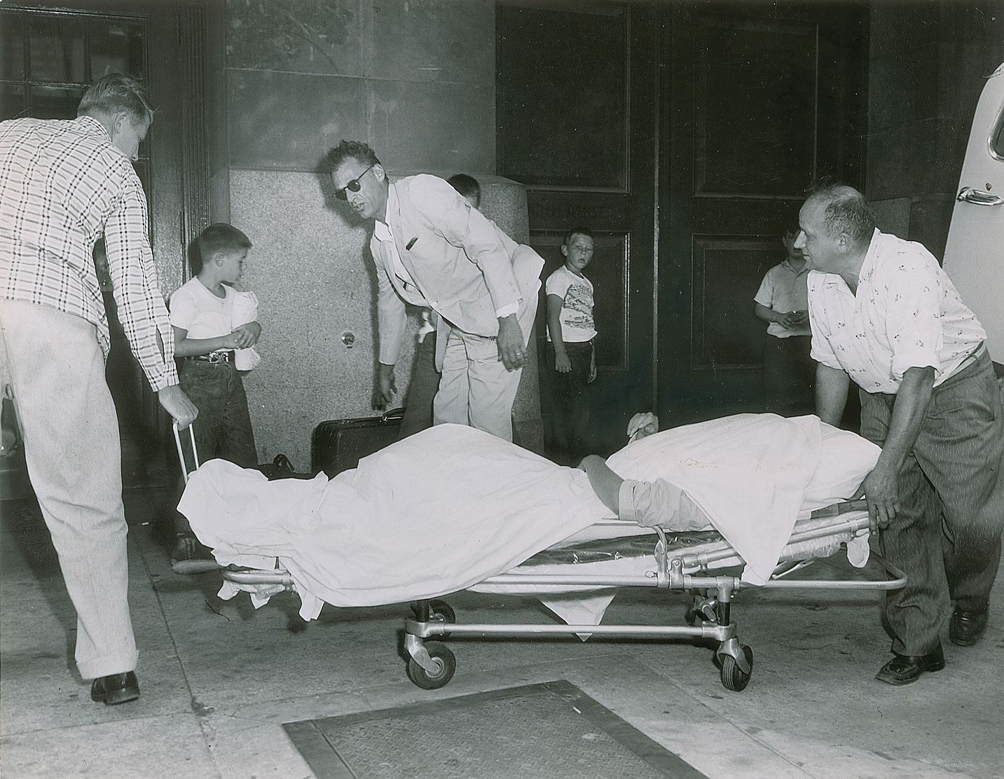 Tragic original vintage glossy 9.25 x 7.25 silver gelatin photo of Marilyn Monroe being wheeled on a stretcher into Doctors Hospital in Manhattan, with husband Arthur Miller in the background, where she underwent emergency surgery after losing her baby in August 1957. Reverse bears a New York Daily News credit stamp. In very good to fine condition, with trimmed edges, and an area of buffing to the emulsion above Marilyn's body.