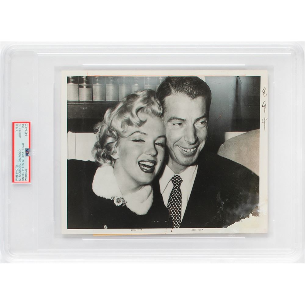 Original vintage circa 1954 glossy 9 x 7 silver gelatin photograph of Marilyn Monroe and Joe DiMaggio inside the judge's chambers for their marriage ceremony on January 14, 1954. The reverse bears a United Press Associations Telephotostamp, an affixed caption, and has been stamp dated January 15, 1954. In very good to fine condition, with scattered light creasing, surface impressions from notations on the back, and emulsion loss to the lower right corner. Encapsulated by PSA as an authentic 'Type III' photograph.