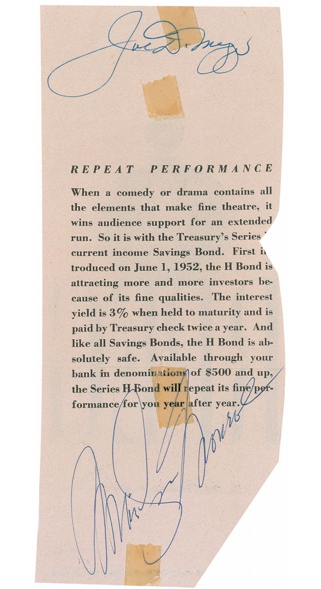 Exceptionally rare combination of vintage ballpoint signatures, “Marilyn Monroe” and “Joe DiMaggio,” on a 3.5 x 8.5 slip irregularly clipped from a magazine ad for savings bonds. In very good condition, with three horizontal folds, one passing through Monroe’s signature, scattered creases, and four affixed toned pieces of tape, two over small areas of the top and bottom of Monroe’s signature and one over a section of DiMaggio’s. Accompanied by a full letter of authenticity from PSA/DNA. This is just the fifth pairing of Monroe and DiMaggio that we have offered—similar items rarely enter the marketplace. The relatively short duration of their relationship—roughly two years—make single items signed by both legends quite difficult to find. A highly desirable and incredibly scarce set of signatures from one of America’s most glamorous couples.