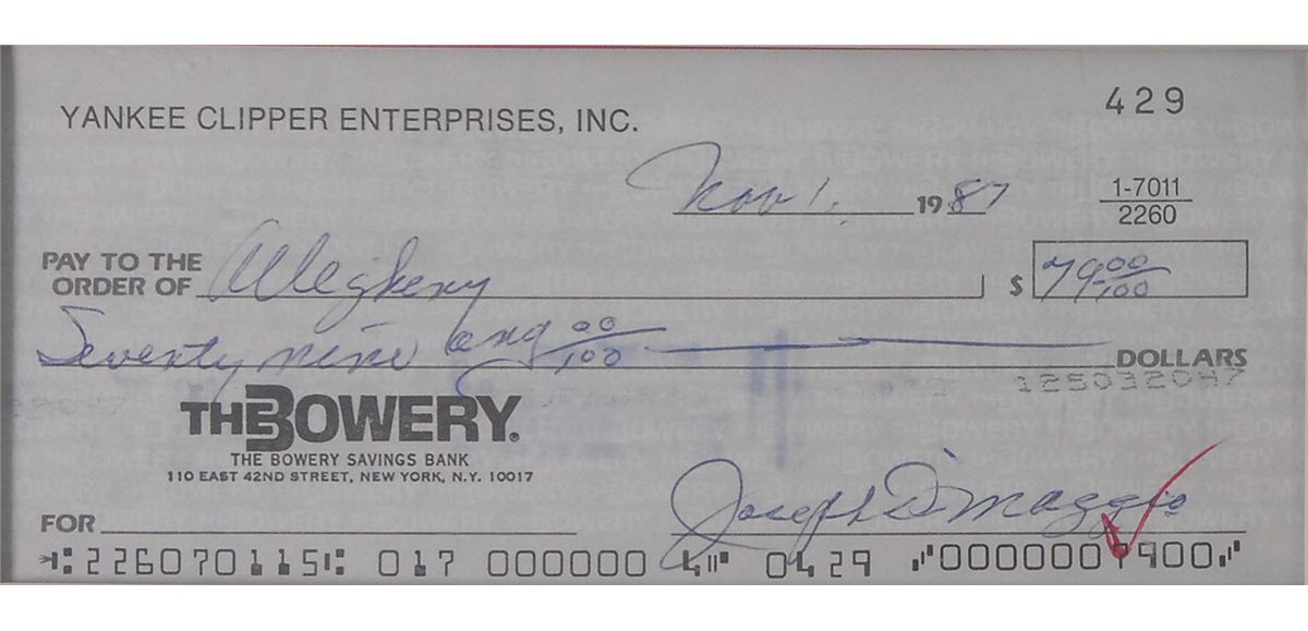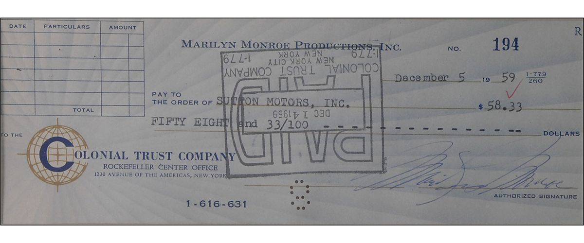 Marilyn Monroe Productions, Inc., business check, 8 x 3, filled out in type and signed by Marilyn Monroe, payable to Sutton Motors, Inc. for $58.33, dated December 5, 1959; and a Yankee Clipper Enterprises, Inc. business check, 6 x 2.5, filled out in another hand and signed by Joe DiMaggio, “Joseph DiMaggio,” payable to Allegheny for $79.00, dated November 1, 1987. Both checks are double-matted and framed together with a color copy of their marriage certificate and five photos of the couple, to an overall size of 31 x 29. In fine condition, with bank stamp to body of Monroe’s check touching the opening stroke of her signature, and a red check mark to the end of DiMaggio’s signature, as well as some light show-through from stamps on reverse. An impressive display of the iconic pair. Oversized.