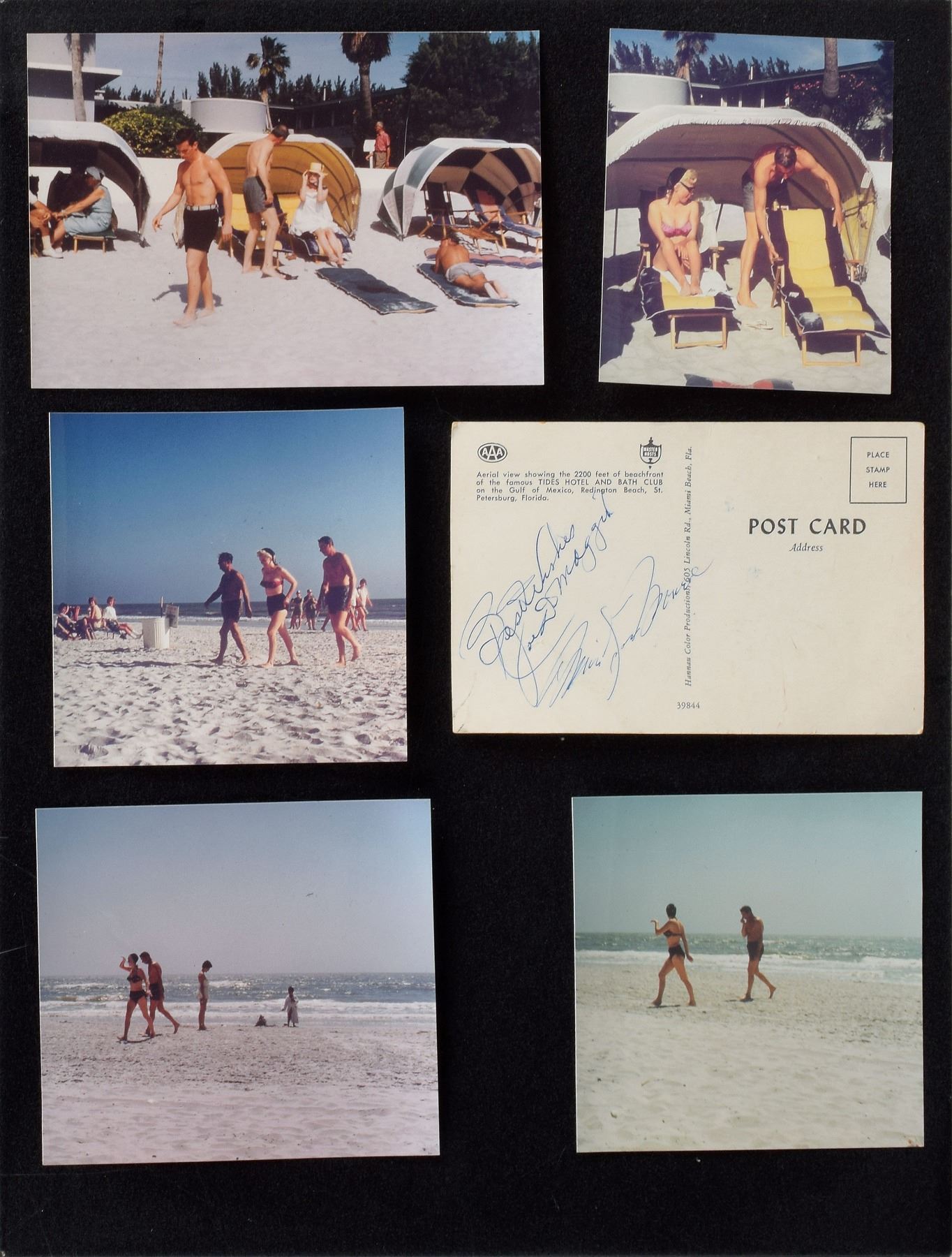 Vintage ballpoint signatures, "Marilyn Monroe" and "Best wishes, Joe DiMaggio,” on the reverse of a 5.5 x 3.5 AAA postcard for Florida's Tides Hotel and Bath Club. Includes a set of five vintage color candid photographs, ranging in size from 3.25 x 4 to 5.75 x 4, each showing the vacationing Monroe and DiMaggio relaxing under cabanas and strolling the shoreline of North Redington Beach. The postcard and photos are mounted and displayed within a transparent case to an overall size of 11.25 x 14.25. In overall fine condition.