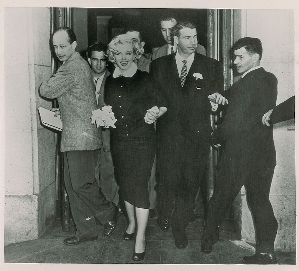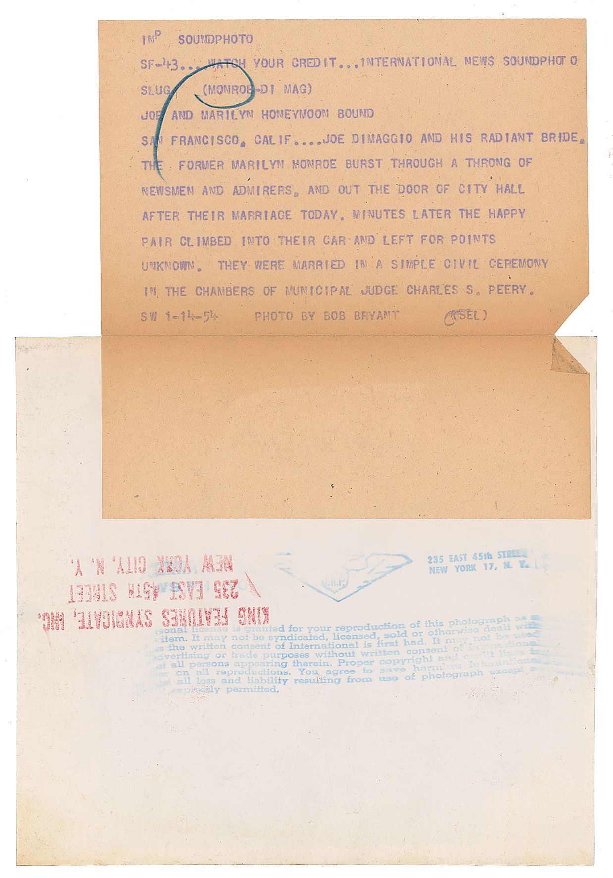 Original vintage glossy 7.5 x 7 silver gelatin photo of the newlywed Marilyn Monroe and Joe DiMaggio bursting through the doors of city hall following their marriage on January 14, 1954. Reverse bears an affixed caption and stamps from International News Photos and King Features Syndicate. In fine condition.