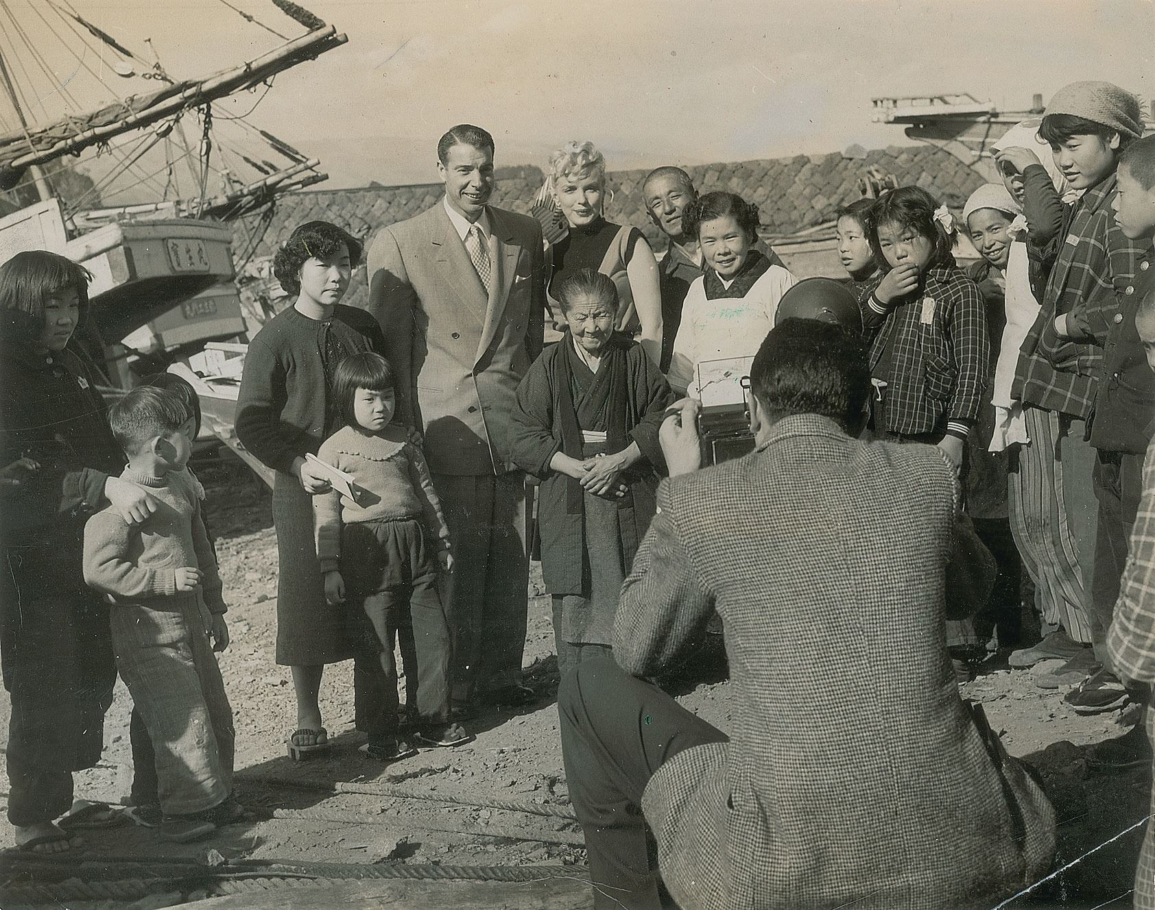 Original vintage glossy 8.25 x 6.5 silver gelatin photo of Marilyn Monroe and Joe DiMaggio posing for photographs during their visit to the Kawana fishing village in Japan. Reverse bears a partial Phil Burchman credit label and pencil annotations. In very good to fine condition, with scattered light creasing to the edges.