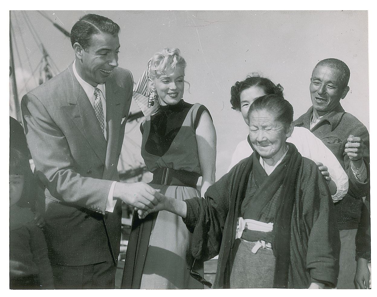 Original vintage glossy 8 x 6.25 silver gelatin photo of Marilyn Monroe and Joe DiMaggio during their 1954 honeymoon in Japan. Reverse bears a "George Zeno Collection" stamp. In fine condition, with trimmed edges, and some very subtle pre-publication enhancements.