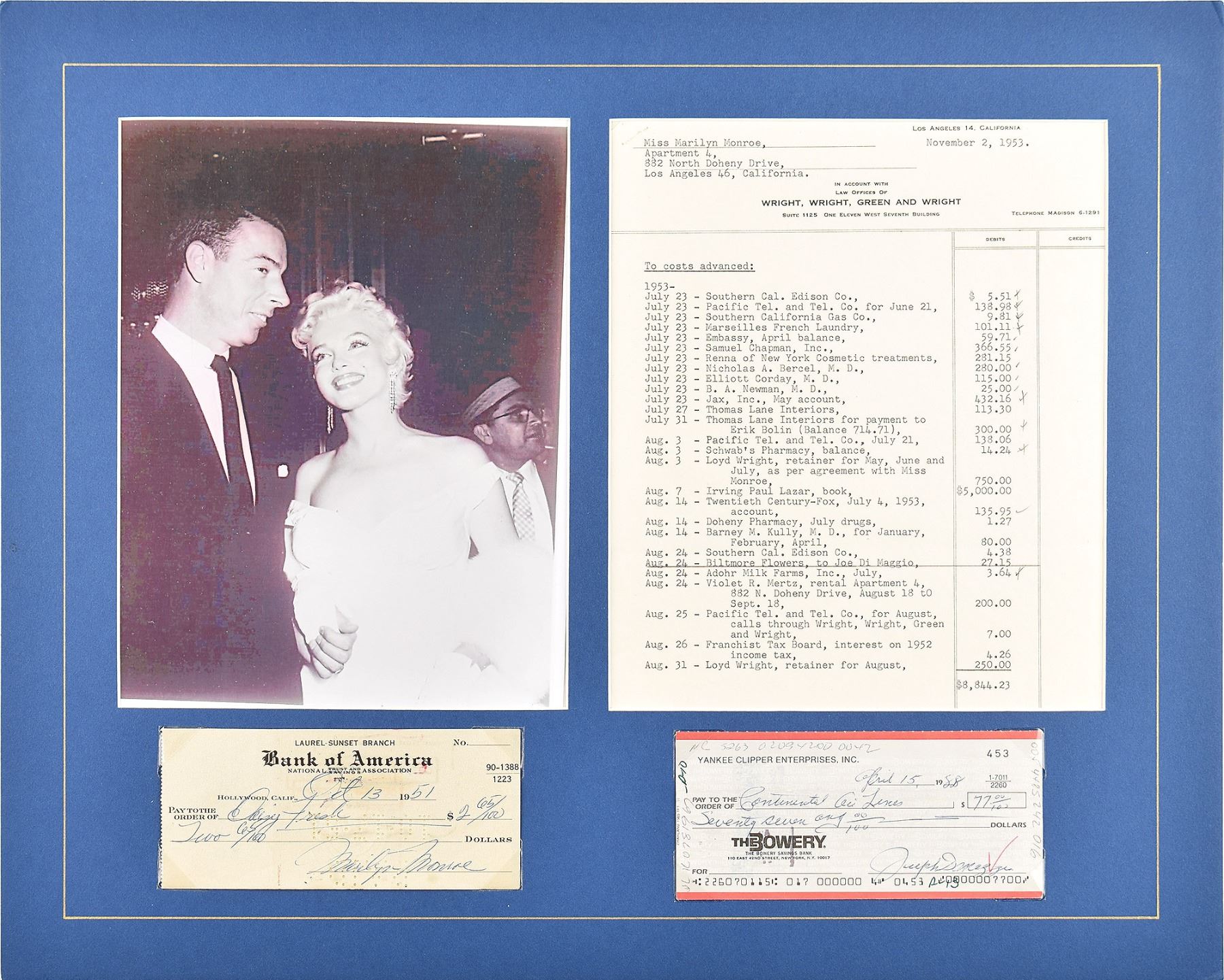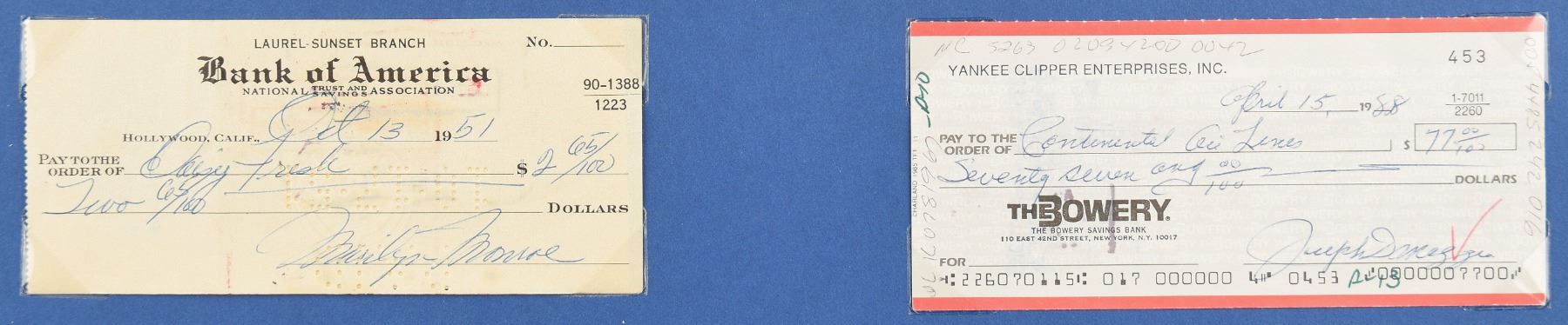Highly desirable pairing of checks: a Bank of America check filled out and signed by Monroe, "Marilyn Monroe," payable to Daisy Fresh for $2.65, October 13, 1951; and a Yankee Clipper Enterprises check, filled out and signed by DiMaggio, "Joseph DiMaggio," payable to Continental Airlines for $77, April 15, 1988. Removably corner-mounted and matted with an image of Monroe and DiMaggio, and a copy of Marilyn's 1953 account ledger page to an overall size of 20 x 16; the ledger page shows a payment for a delivery of flowers to Joe DiMaggio, revealing their loving relationship. In overall fine condition.