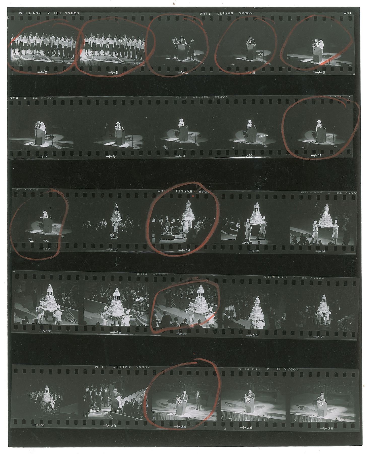 Spectacular original vintage glossy 7.75 x 9.75 silver gelatin contact sheet print chronicling Marilyn Monroe's famous performance of 'Happy Birthday, Mr. President' at Madison Square Garden on May 19, 1962, for John F. Kennedy's 45th birthday celebration. The 25 images show Peter Lawford's introduction of Monroe, her performance of the infamous song, the presentation of an enormous birthday cake to JFK, and President Kennedy's response, alluding to Monroe's sultry delivery and appearance: 'I can now retire from politics after having had Happy Birthday sung to me in such a sweet, wholesome way.' Reverse bears a Friedman-Abeles credit stamp. In fine condition, with trimmed edges and ten images circled in grease pencil.