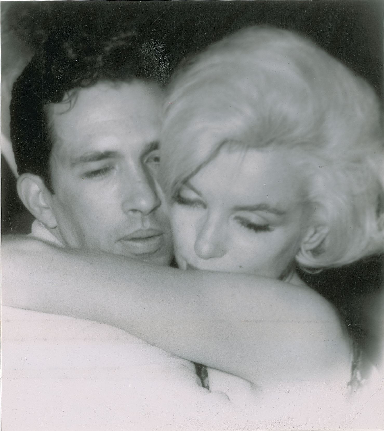 Original vintage glossy 6.75 x 7.5 silver gelatin photo of Monroe dancing in a close embrace with Mexican screenwriter Jose Bolanos at a club in Mexico City in February 1962. Reverse bears annotations and an affixed caption. In fine condition, with trimmed edges and a crease to the lower right corner.