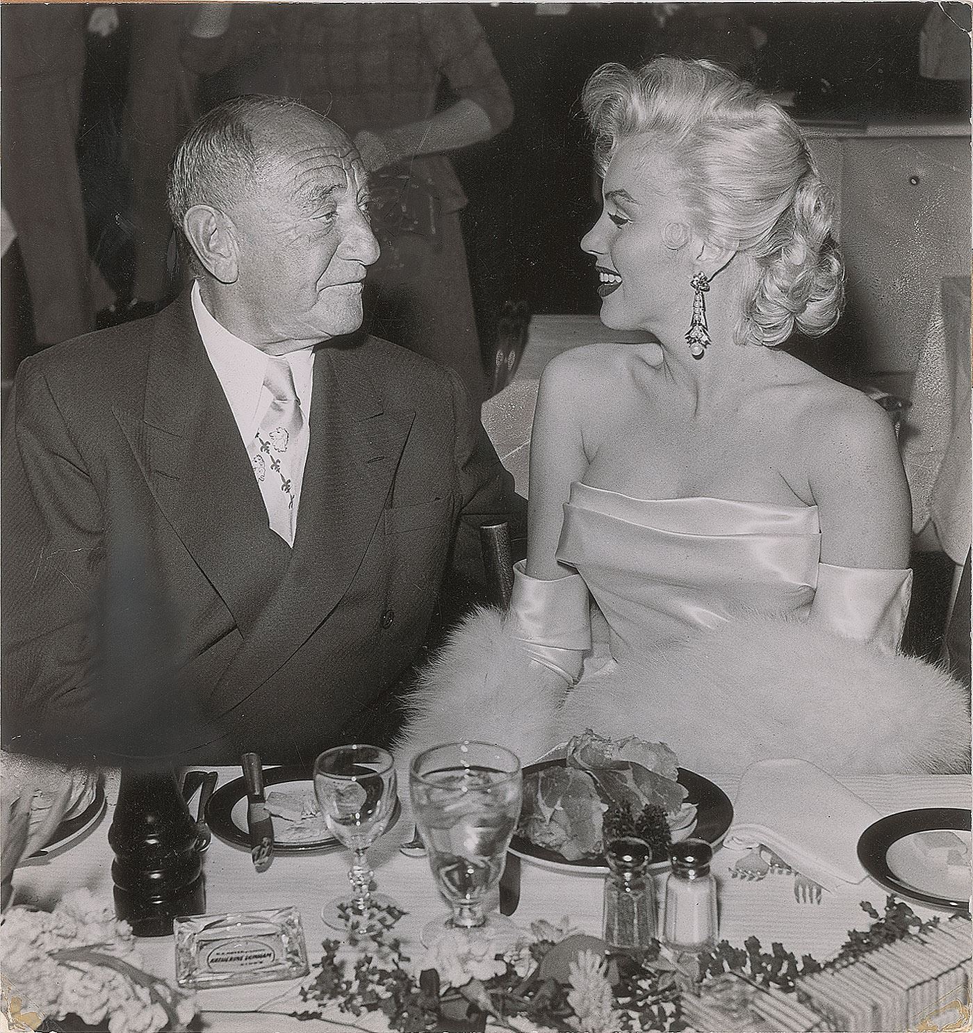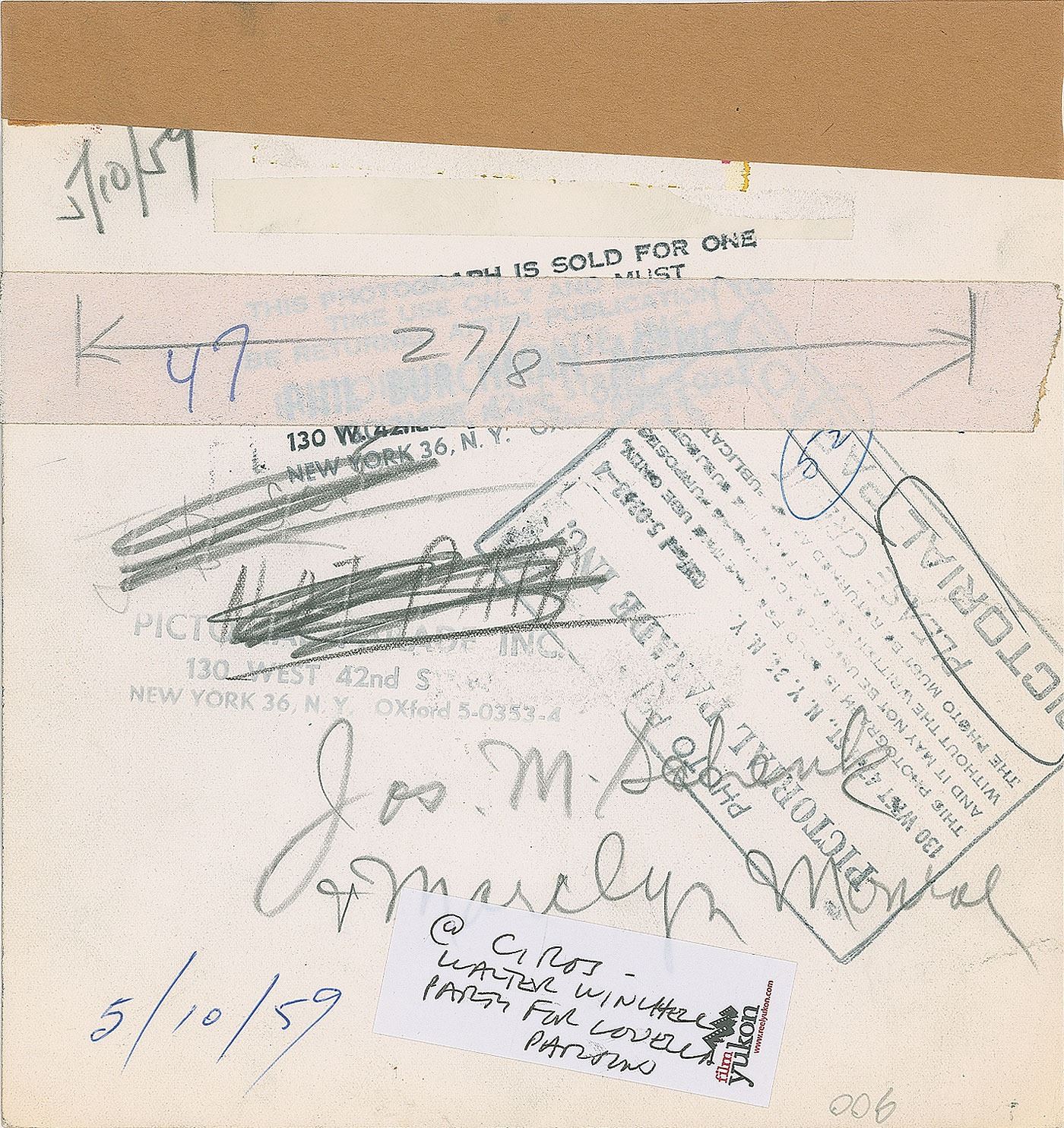 Original vintage matte-finish 7.25 x 7.5 silver gelatin photo of Marilyn Monroe with studio executive Joseph M. Schenck at a birthday party for Walter Winchell held at Ciro's Nightclub. Reverse bears Pictorial Parade credit stamps and several annotations. In fine condition, with trimmed edges, and scattered light creasing and surface impressions.