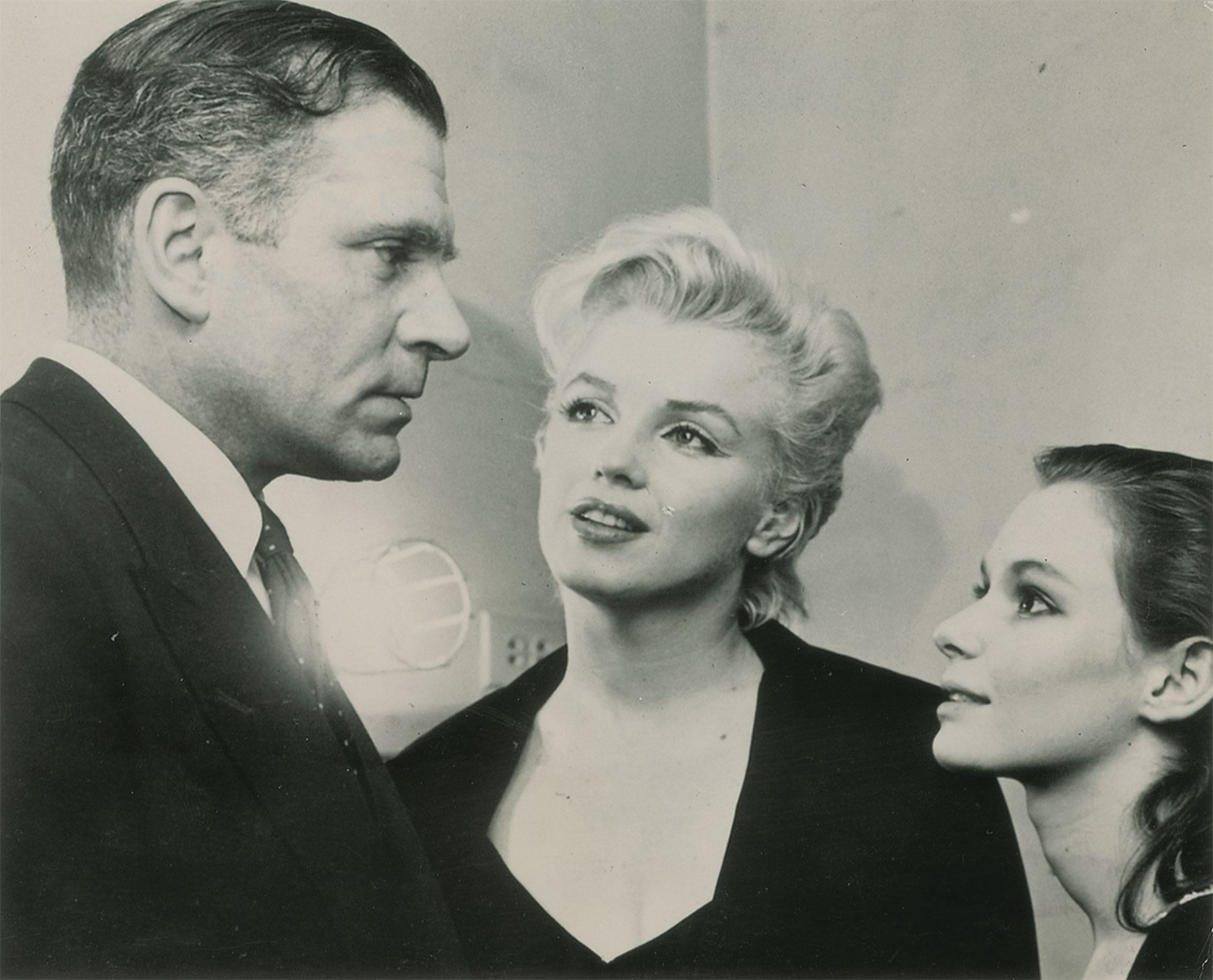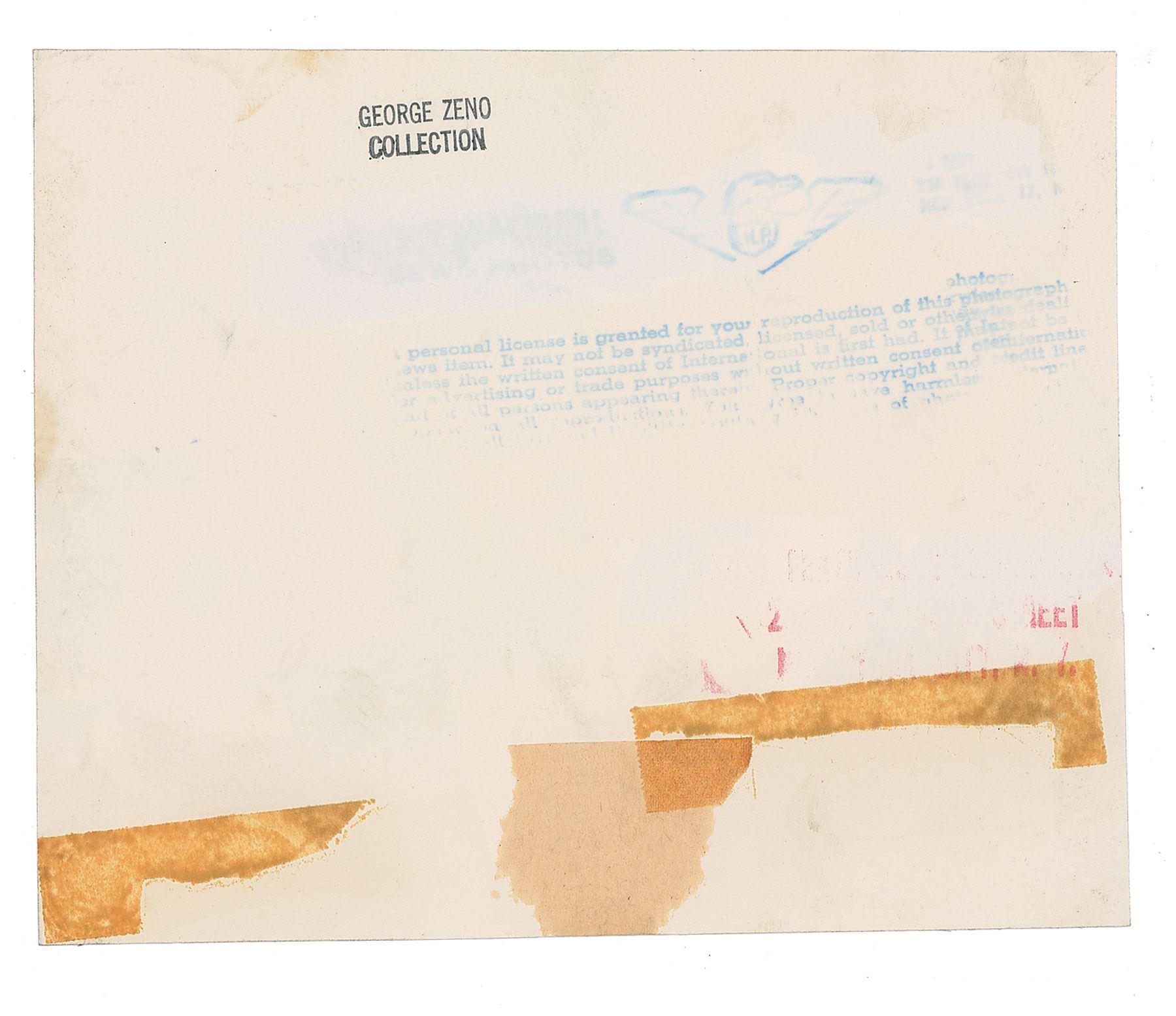 Original vintage glossy 7.75 x 6.25 silver gelatin photo of Marilyn Monroe with The Prince and the Showgirl co-star Laurence Olivier. Reverse bears an ink press stamp and "George Zeno Collection" stamp. In fine condition, with evenly trimmed edges and scattered light surface impressions.