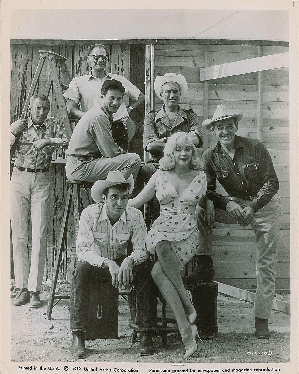 Original vintage glossy 8 x 10 silver gelatin photo of the cast and crew of The Misfits—Marilyn Monroe, Clark Gable, Montgomery Clift, Eli Wallach, Arthur Miller, and John Huston—posing together on set. Lower border bears a 1960 United Artists copyright notice. In fine condition.