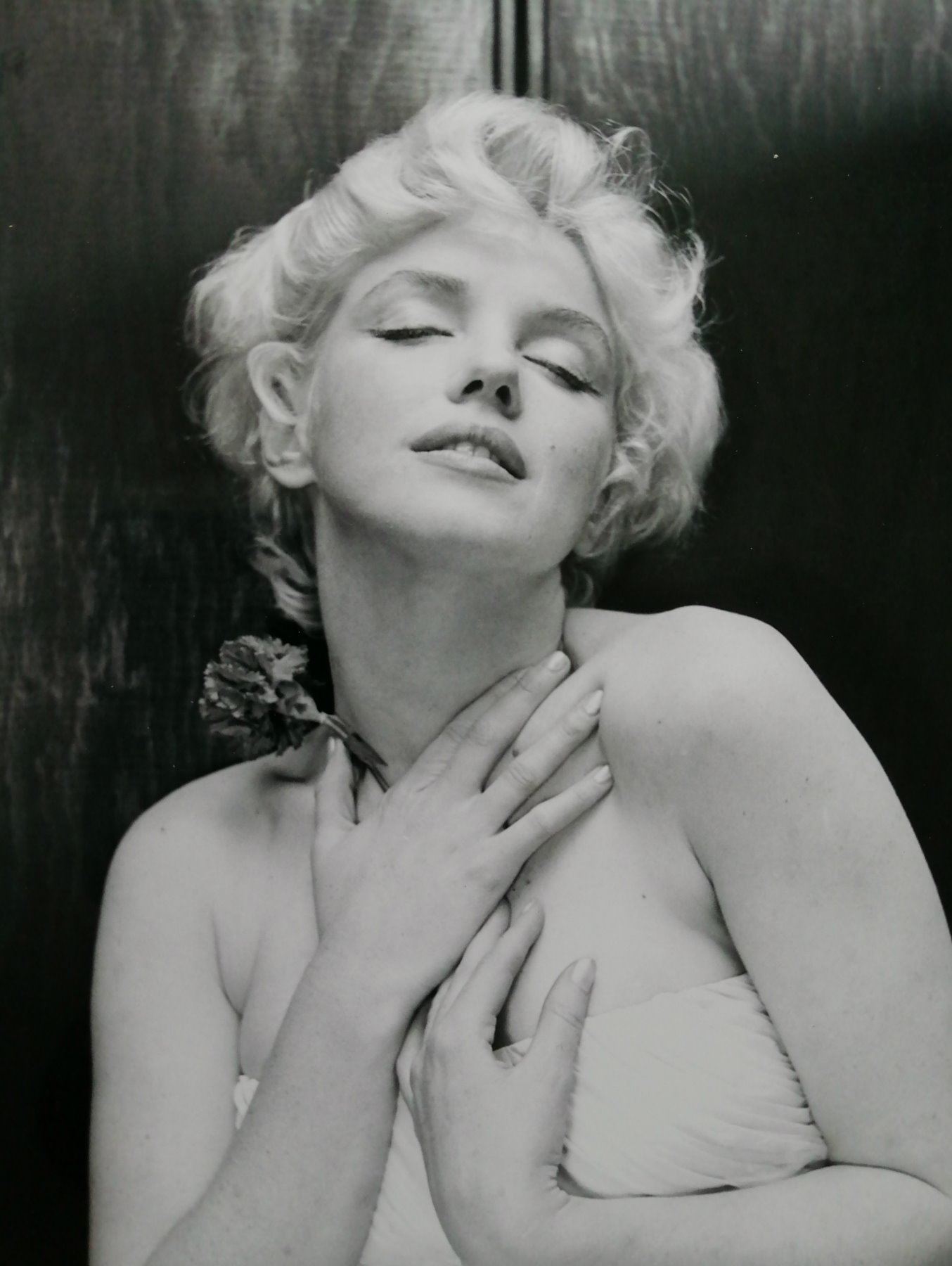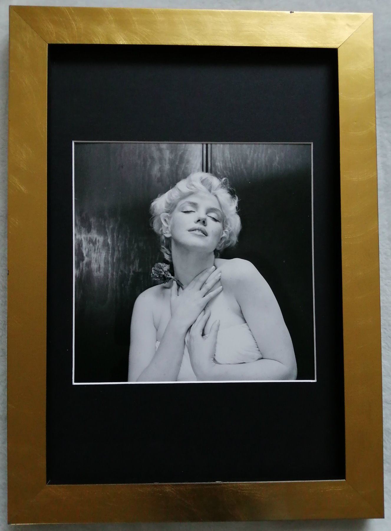 Marilyn at the Ambassador hotel, New York by Cecil Beaton. Marilyn Monroe 1956. Printed later. CECIL BEATON (1904-1980). Gelatin silver print, mounted on board. Sotheby and Beatons stamps on board. Size of image:9.5x9.5 inches. Framed in a heavy wooden lacquered gold coloured frame. (Some chips in frame).