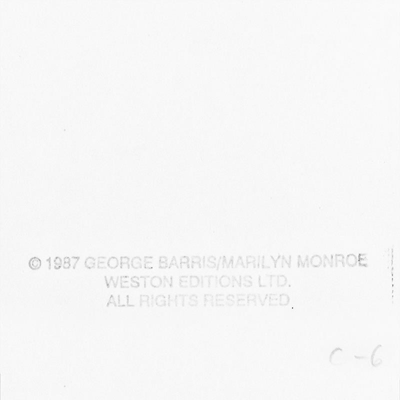 "Marilyn Monroe: The Last Shoot" is a photograph printed from the original negative taken by George Barris (1922-2016), hand signed by the photographer. This photo is part of a series entitled "The Last Photos"; they were taken in 1962 just two weeks before Monroe's death and are considered the last photos ever taken of the icon. This photo bears the Edward Weston copyright stamp inverso and Includes Letter of Authenticity. Measures approx. 11" x 14" (image). Please note: due to the age of this piece the paper is slightly wavy.