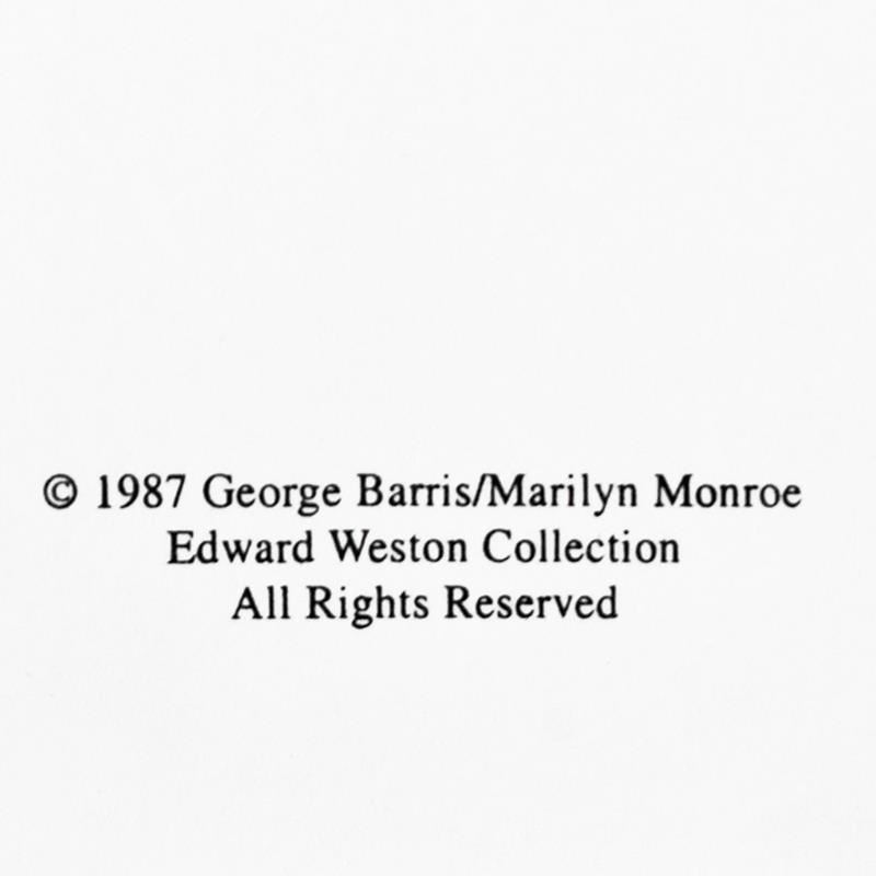 Marilyn Monroe by George Barris (1922-2016). Please see photos and description for all available information. "Marilyn Monroe: The Last Shoot" is a photograph printed from the original negative taken by George Barris (1922-2016), hand signed by the photographer. This photo is part of a series entitled "The Last Photos"; they were taken in 1962 just two weeks before Monroes death and are considered the last photos ever taken of the icon. This photo bears the Edward Weston copyright stamp inverso and Includes Letter of Authenticity. Measures approx. 11" x 14" (image). Due to the age of the piece the paper is slightly wavy.