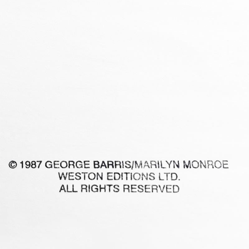Marilyn Monroe by George Barris (1922-2016). All available information is listed in the description and shown in the photo. "Marilyn Monroe: The Last Shoot" is a photograph printed from the original negative taken by George Barris (1922-2016), hand signed by the photographer. This photo is part of a series entitled "The Last Photos"; they were taken in 1962 just two weeks before Monroe's death and are considered the last photos ever taken of the icon. This photo bears the Edward Weston copyright stamp inverso and Includes Letter of Authenticity. Measures approx. 14" x 11" (image). Due to the age of the piece the paper is slightly wavy.