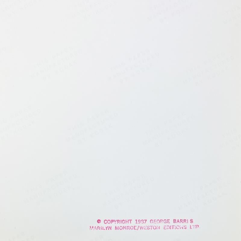 "Marilyn Monroe: The Last Shoot" is a photograph printed from the original negative taken by George Barris (1922-2016). This photo is part of a series entitled "The Last Photos"; they were taken in 1962 just two weeks before Monroe's death and are considered the last photos ever taken of the icon. This piece is numbered inverso and hand signed by the photographer. This photo bears the Edward Weston copyright stamp inverso and Includes Letter of Authenticity. Measures approx. 11" x 14" (image).