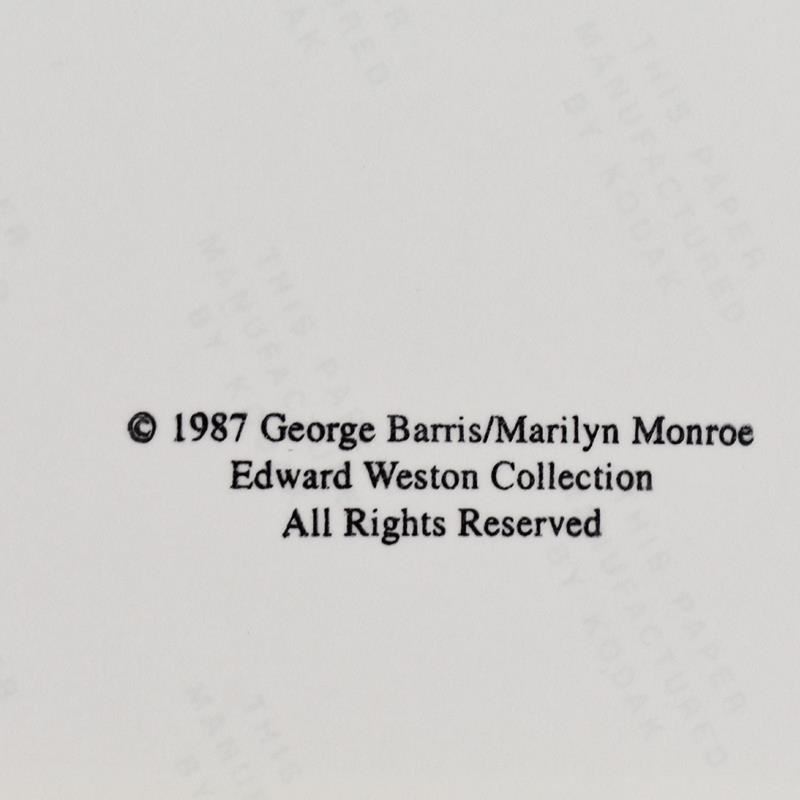 "Marilyn Monroe: The Last Shoot" is a photograph printed from the original negative taken by George Barris (1922-2016), hand signed by the photographer. This photo is part of a series entitled "The Last Photos"; they were taken in 1962 just two weeks before Monroe's death and are considered the last photos ever taken of the icon. This photo bears the Edward Weston copyright stamp inverso and Includes Letter of Authenticity. Measures approx. 14" x 11" (image).