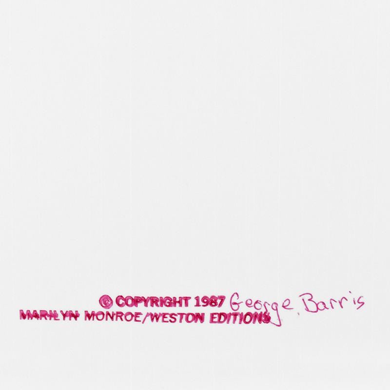 "Marilyn Monroe: The Last Shoot" is a photograph printed from the original negative taken by George Barris (1922-2016). This photo is part of a series entitled "The Last Photos" which were taken in 1962 just two weeks before Monroe's death and are considered the last photos ever taken of the icon. This piece is numbered inverso and hand signed by the photographer. This photo bears the Edward Weston copyright stamp inverso and includes Letter of Authenticity. Measures approx. 8" x 10" (image).