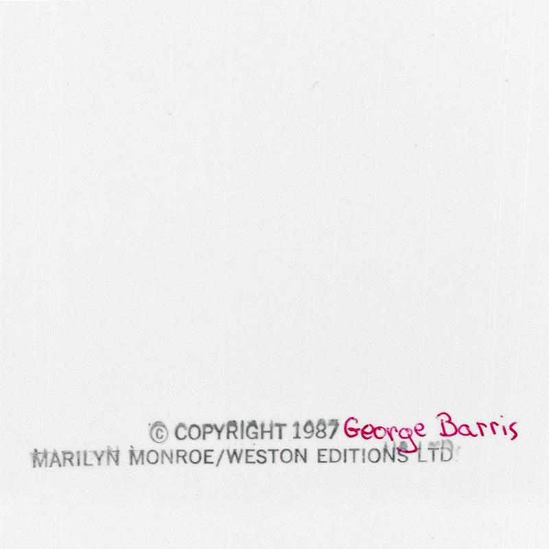 "Marilyn Monroe: The Last Shoot" is a photograph printed from the original negative taken by George Barris (1922-2016). This photo is part of a series entitled "The Last Photos" which were taken in 1962 just two weeks before Monroes death and are considered the last photos ever taken of the icon. This piece is hand signed by the photographer and bears the Edward Weston copyright stamp inverso and includes Letter of Authenticity. Measures approx. 8" x 10" (image).