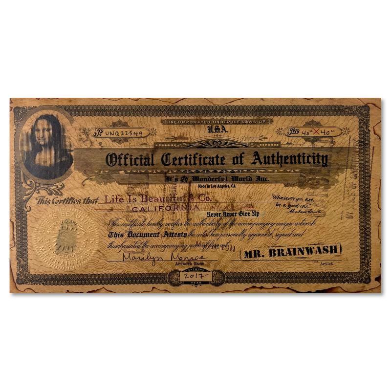Marilyn Monroe by Mr Brainwash Original. Please see photos and description for all available information. "Marilyn Monroe" is a unique (UNIQ) mixed media on deckle edge paper by Mr. Brainwash, hand signed inverso and bearing the thumbprint of the artist. This piece comes custom framed. Includes Certificate of Authenticity. Measures approx. 44" x 44" (frame), 40" x 40" (image).