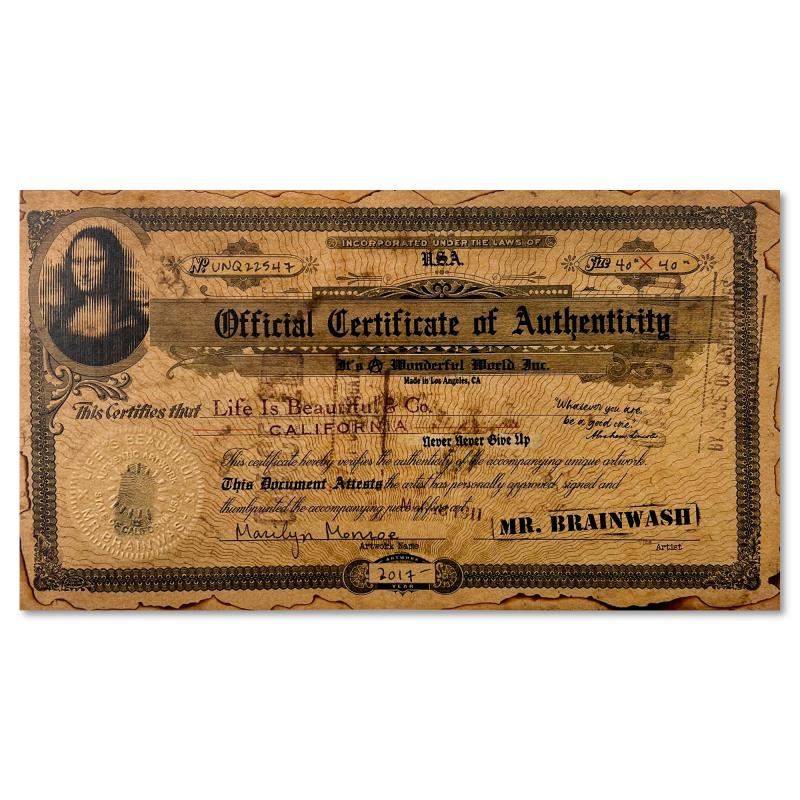 "Marilyn Monroe" is a unique (UNIQ) mixed media on deckle edge paper by Mr. Brainwash, hand signed inverso and bearing the thumbprint of the artist. This piece comes custom framed. Includes Certificate of Authenticity. Measures approx. 44" x 44" (frame),