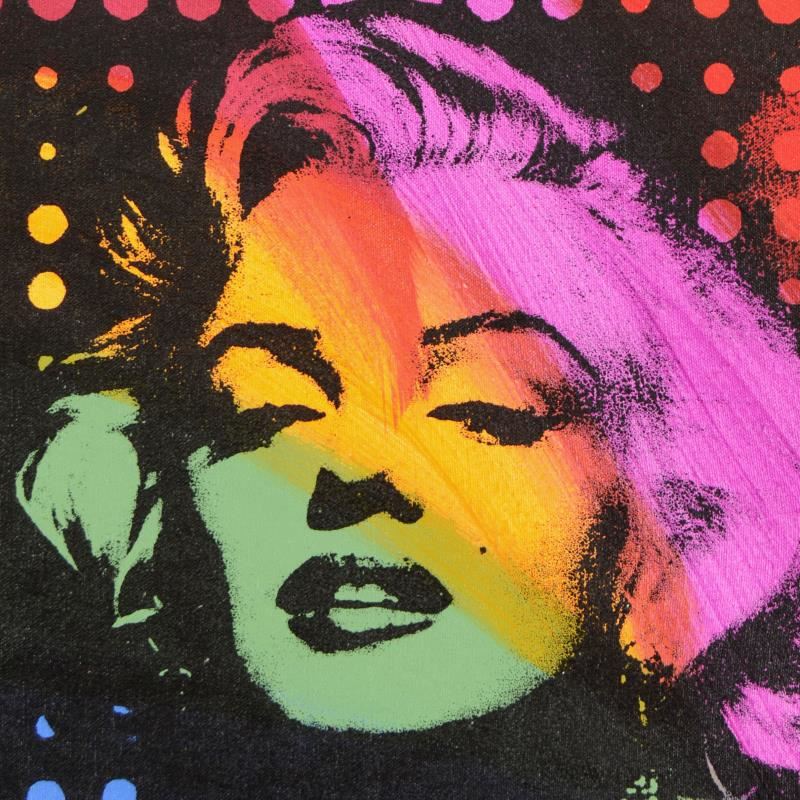 "Marilyn Monroe" is a one-of-a-kind hand-pulled silkscreen and acrylic painting on canvas, hand signed by Gail Rodgers. Includes Certificate of Authenticity. This piece is meant to be gallery wrapped. Canvas dimensions measure approx. 23" x 23" and image dimensions (after stretching) 16" x 16" (image).