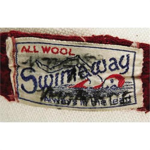 <B>Marilyn Monroe's Burgundy Wool Bathing Suit.</B></I> A pre-1950s-style wool bathing suit, a personal item belonging to Marilyn Monroe. The wool one-piece suit would have weighed more than twice its amount when wet, but on Monroe nothing looked uncomfortable. Monroe's name is written on the Swimaway label in black ink. In Excellent condition. <I> Accompanied by COA from L.A. Prop and Wardrobe Co.</B></I><BR><BR><b>Shipping:</b> Clothing, Costumes & Jerseys (<a target="_blank" href="http://www.heritageauctions.com/common/shipping.php">view shipping information</a>)