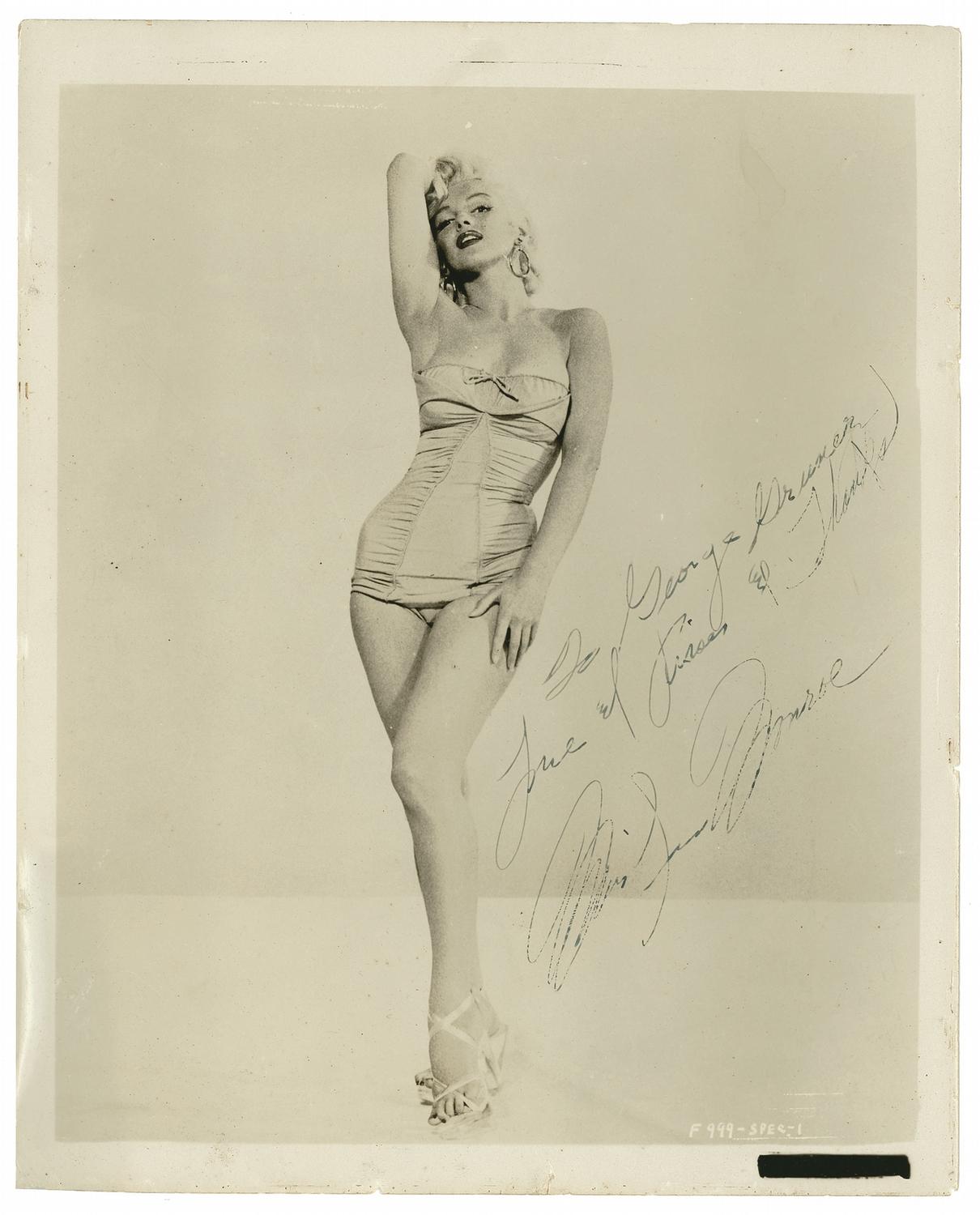 Incredibly sexy vintage glossy 8 x 10 full-length photo of Marilyn in a light bathing suit, with one hand in her hair, signed and inscribed in fountain pen “To George Gruner, Love & Kisses & Thanks, Marilyn Monroe.” By the summer of 1955, Marilyn had taken up residence in New York at the Waldorf-Astoria Towers. Light irregular adhesion and skipping to Monroe’s signature and portion of inscription, silvering to darker areas of image, scattered creases and surface marks, and a few small edge tears, otherwise very good condition. George Gruner installed the white carpet in Marilyn’s apartment. Accompanied by a photocopied letter of provenance from his children, Laurie Gruner and Peter Gruner, which reads, “Our father George Gruner was a carpet installer in New York City he had the honor of installing carpet for Marilyn Monroe in an apartment she shared with Arthur Miller when the job was done she gave him two signed photo’s as a tip and told him one day they would be worth a little cash for you and your family boy was she right one was made out to George Gruner and one to his son Peter. We enjoyed them for 55 years.” Authentically signed Marilyn Monroe images are scarce, and an example such as this, personalized and with exceptional provenance, is especially desirable.