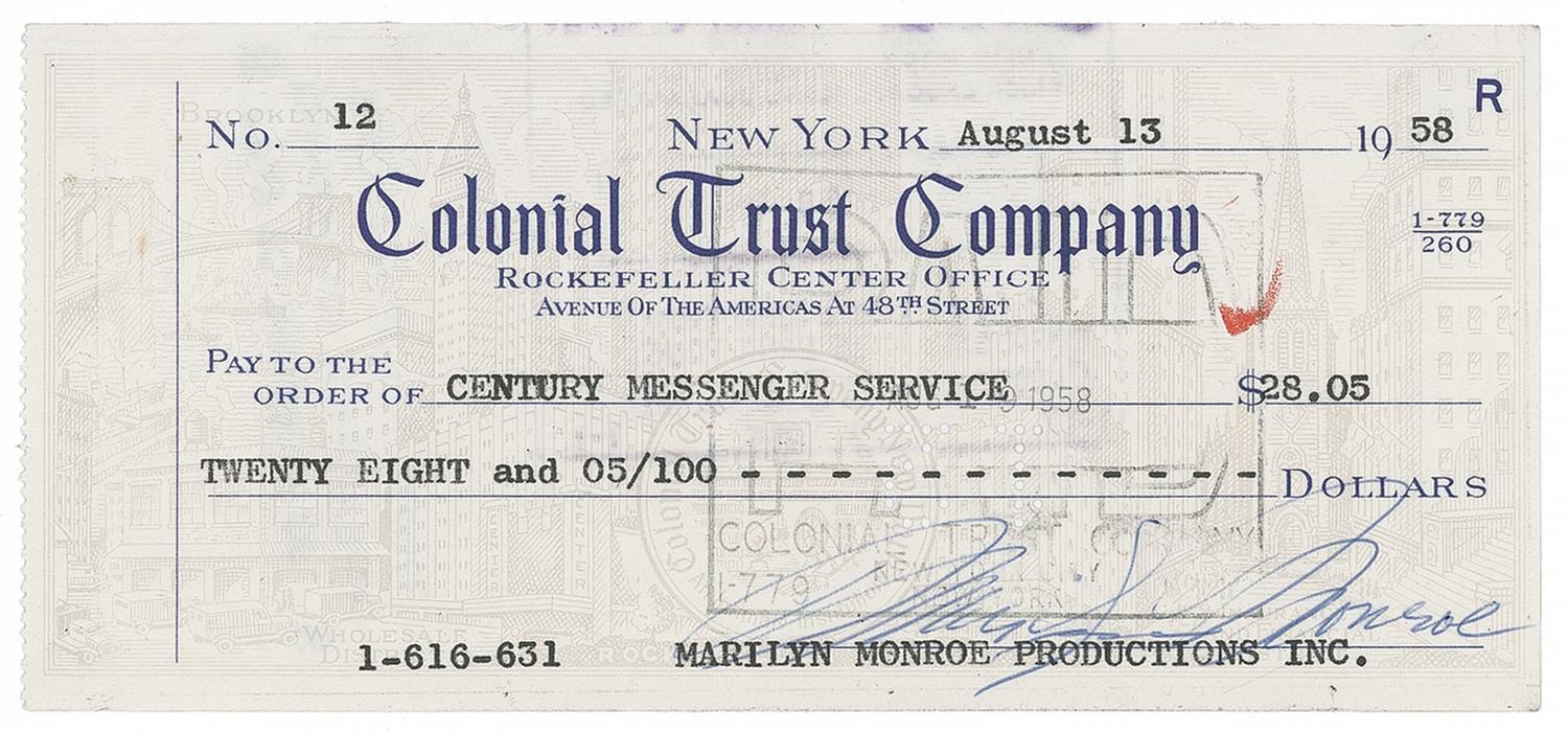 Bank check, 6 x 2.75, filled out in type and signed by Monroe, as president of Marilyn Monroe Productions, payable to Century Messenger Service for $28.05, August 13, 1958. Light bank stamp over portion of signature and cancellation holes to body, otherwise fine condition. With the encouragement of her husband, Arthur Miller, Marilyn returned to star in one of her greatest roles—”Sugar Kane” in the Billy Wilder classic, Some Like It Hot. This check dates from a brief rest period before her career resumed.