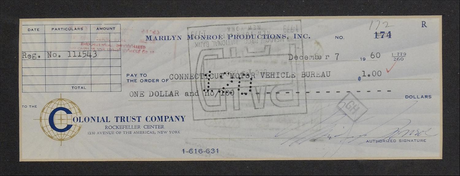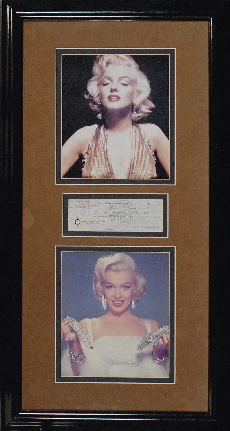 Marilyn Monroe Productions bank check, 8.25 x 3, filled out in type and signed by Monroe, payable to the Connecticut Motor Vehicle Bureau for $1.00, December 7, 1960. Elaborately double suede matted with two color photos and framed to an overall size of 20.5 x 38.5. Expected bank cancellation holes and stamps lightly affecting the signature, otherwise fine condition. A well-preserved example. Oversized.