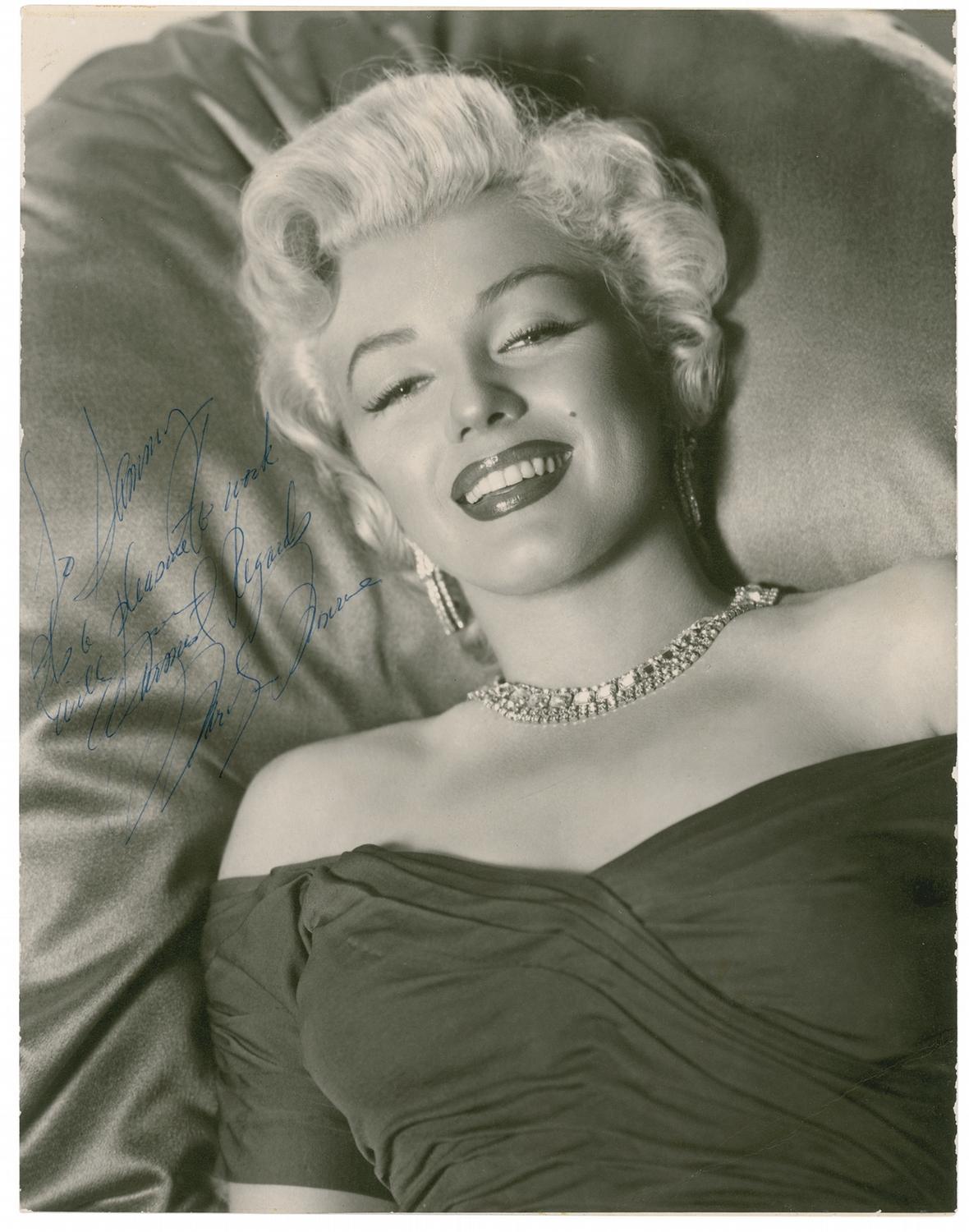 Vintage oversized matte-finish 10.5 x 13.5 crystal-clear head-and-shoulders smiling portrait of the recumbent Marilyn lying on a cushion, adorned in diamonds with her hair and make-up looking perfect and precise, signed and inscribed in blue ballpoint, “To Sammy. It’s a pleasure to work with you. Warmest regards, Marilyn Monroe.” Larger format photos such as this were generally only given to very close friends or other personal acquaintances, and are very seldom offered for sale; in this case, the ‘Sammy’ Marilyn refers to is Sam Benson from the Wardrobe Department who worked on numerous Monroe films including Gentlemen Prefer Blondes and How To Marry A Millionaire. In very good to fine condition, with lightly trimmed edges, some scattered light surface loss to edges, a diagonal crease to lower right corner, remarkably unobtrusive professionally repaired creases to her forehead area and to an area of the cushion background, and a few light spots to lower portion of image, none of which affects her florid handwriting or strikingly large signature. Accompanied by a letter of authenticity from James Spence. A rare and exquisite portrait, exceedingly uncommon in this oversized and highly displayable format.