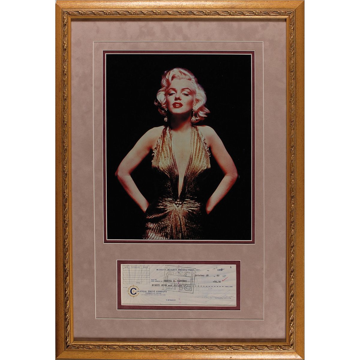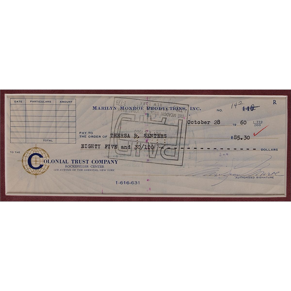 Marilyn Monroe Productions, Inc. business check, 8.25 x 3, filled out in type and signed by Monroe, payable to Thersa B. Senters for $85.30, October 28, 1960. Double-suede matted and framed, with a breathtaking color glossy photo of Monroe, to an overall size of 19 x 27. In very good condition, with a central vertical fold, light corner creasing, and the expected cancellation stamps and notations, with the show-through from a stamp on the reverse lightly affecting the first letter of the florid signature, and the signature a shade light. Oversized.