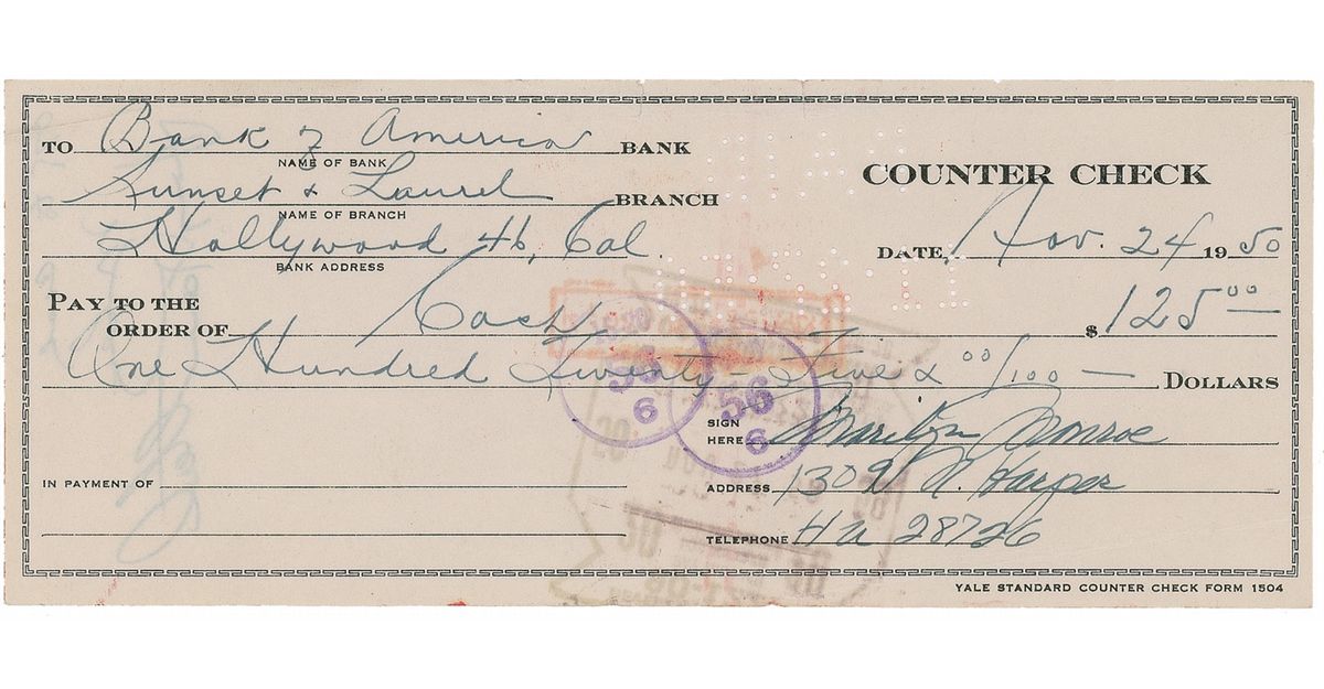 Bank check, 8.25 x 3.25, filled out in another hand and signed by Monroe, “Marilyn Monroe,” adding her address, 1309 Harper Avenue in Los Angeles, where she lived for less than a year during 1950–51, as well as her phone number, payable to Cash for $125.00, November 24, 1950. In very good condition, with scattered creases, a few small edge tears, cancellation holes to top, and several bank stamps over beginning of signature. The year in which she wrote this check proved to be a turning point in Monroe’s fledgling career. After a handful of trivial parts in trivial films, she appeared in small but crucial roles in two of the most-watched films of 1950—roles that finally brought her to the forefront of the public’s imagination: Louis Calhern’s seductive “niece” in The Asphalt Jungle, and the scene-stealing party guest (and graduate of the “Copacabana School of Dramatic Art”) in All About Eve.