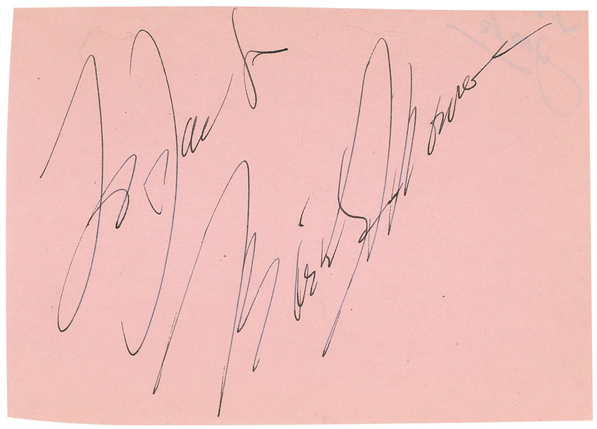 Large vintage fountain pen signature and inscription, “For Jack, Marilyn Monroe,” on a light pink 5.25 x 3.75 album page. In fine condition, with lightly trimmed edges and some trivial edge creases.
