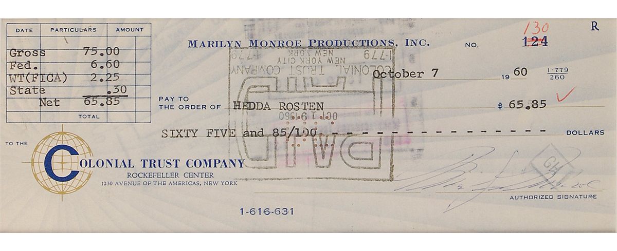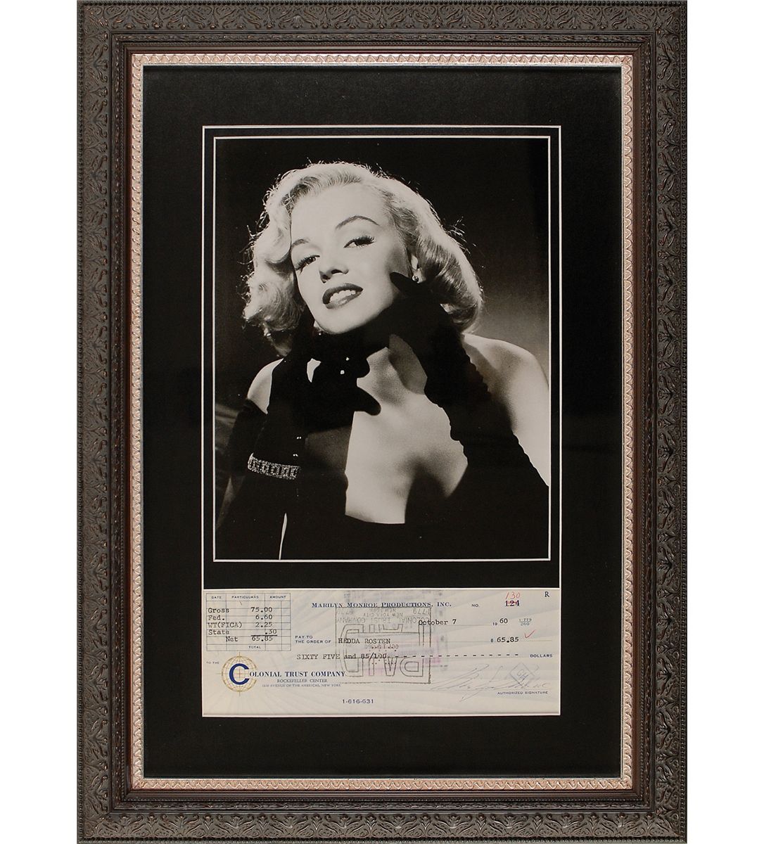 Marilyn Monroe Productions, Inc. business check, 8.25 x 3, filled out in type and signed by Monroe, payable to Hedda Rosten for $65.85, October 7, 1960. Matted and framed with a gorgeous portrait to an overall size of 14.5 x 20. In fine condition, with a bisecting vertical fold, show-through from cancellation marks on the reverse, and a small stamp over the beginning portion of last name of signature. One of Marilyn’s closest friends, Hedda Rosten served as her secretary during the filming of The Prince and the Showgirl. Though there was a report that Rosten was escorted off the set following a ‘clash’ with director and co-star Laurence Oliver, this mishap never sullied the relationship, as both Rosten and her husband, poet Norman Rosten, were named beneficiaries in the actress’ will.