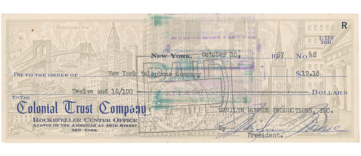 Marilyn Monroe Productions, Inc. business check, 8.25 x 3, filled out in type and signed by Monroe, payable to New York Telephone Company for $12.18, October 10, 1957. In fine condition, with a vertical fold through a single letter of signature, bank stamp to body touching first letter of signature, and other expected holes and stamps.