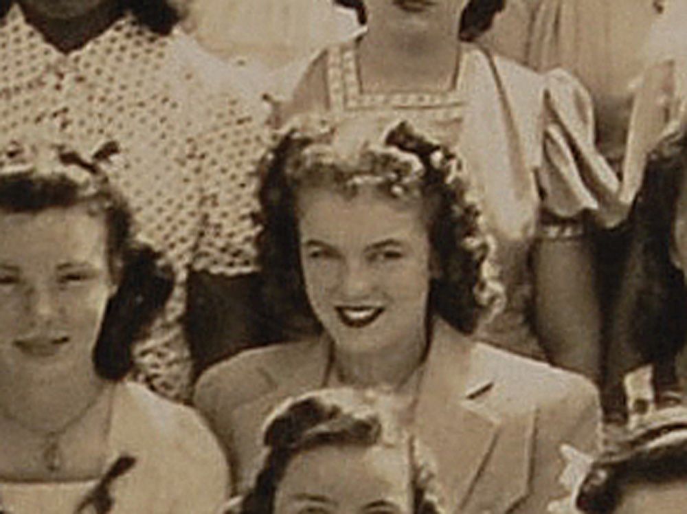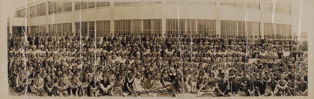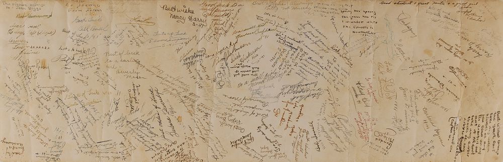 Incredibly scarce vintage 24.75 x 8 panoramic photo of the graduating Class of Summer 1941 Ralph Waldo Emerson Junior High School in Los Angeles, with a radiant Norma Jeane Baker (later Marilyn Monroe) easily identifiable to the right of center in a sea of fresh faces, signed on the reverse in blue ink, “To a swell, nice & perfect girl[?], Norma Jeane Baker.” In good condition, with multiple noticeable heavy vertical creases affecting appearance (one partly separated), two creases passing through letters of Monroe’s signature, several edge tears, Monroe’s cramped signature circled in pencil, moderate creasing and crazing to image. While unsigned versions of this photo appear from time-to-time, signed examples are extremely uncommon, and represent one of the earliest examples of the future starlet’s signature.