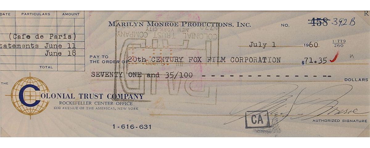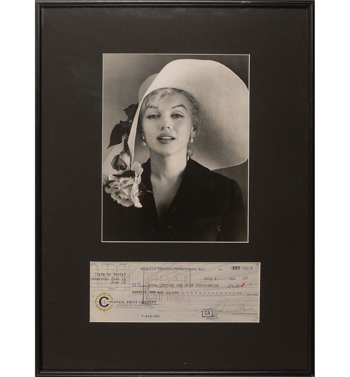 Marilyn Monroe Productions, Inc. business check, 8 x 2.75, filled out in type and signed by Monroe, payable to 20th Century Fox Corporation for $71.35, July 1, 1960. Typed notation in the memo area reads, “(Cafe de Paris) Statements June 11, June 18.” Matted and framed with a portrait of Monroe wearing a large sun hat to an overall size of 13.5 x 18. In fine condition, with expected cancellation holes and stamps, with a small stamp over beginning of signature, and a couple ink and pencil notations.