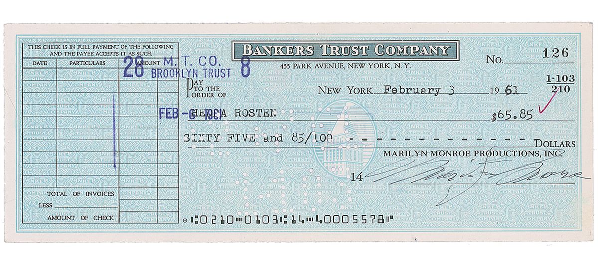 Marilyn Monroe Productions, Inc. business check, 8.25 x 3, filled out in type and signed by Monroe, payable to Hedda Rosten for $65.85, February 3, 1961. In fine condition, with expected cancellation stamps and holes, none affecting the clean signature area. Accompanied by a full letter of authenticity from PSA/DNA. One of Marilyn’s closest friends, Hedda Rosten served as her secretary during the filming of The Prince and the Showgirl. Though there was a report that Rosten was escorted off the set following a ‘clash’ with director and co-star Laurence Oliver, this mishap never sullied the relationship, as both Rosten and her husband, poet Norman Rosten, were named beneficiaries in the actress’s will.