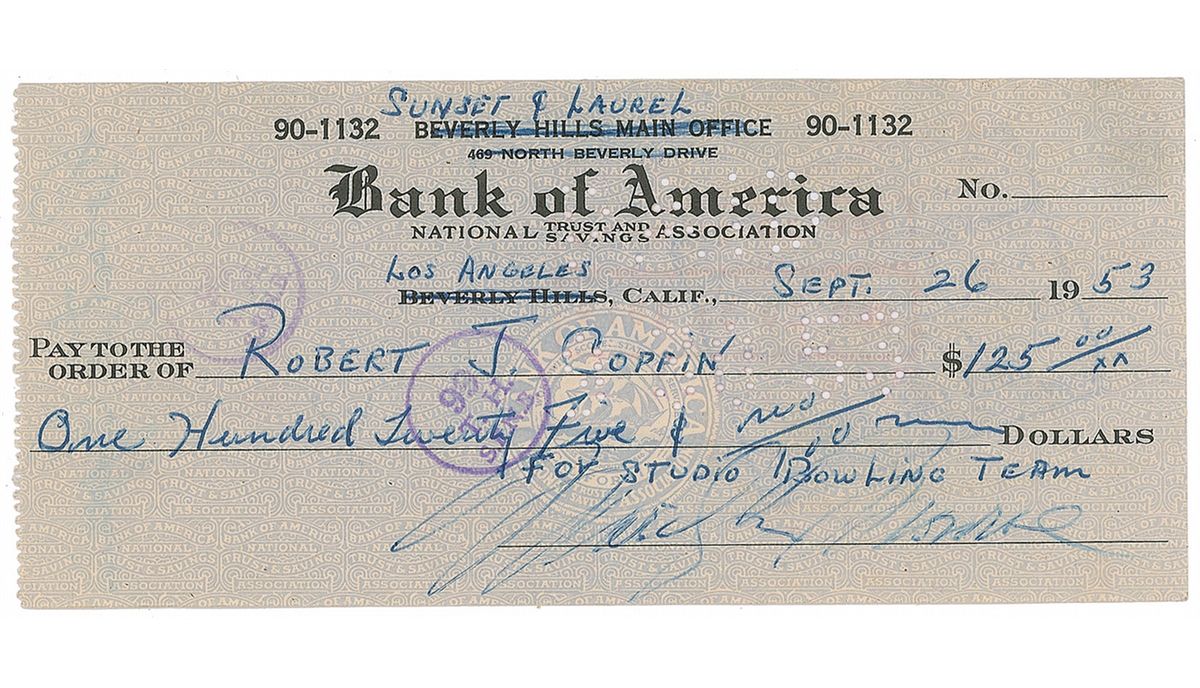 Bank check, 5.75 x 2.5, filled out in another hand and signed by Monroe, payable to Robert J. Coppin for $125.00, September 26, 1953. The check’s address has been corrected in an unknown hand and also bears a notation, “Fox Studio Bowling Team.” Three vertical folds, one through a single letter of signature, expected cancellation stamps and holes, and Marilyn’s signature just a shade light, otherwise fine condition.