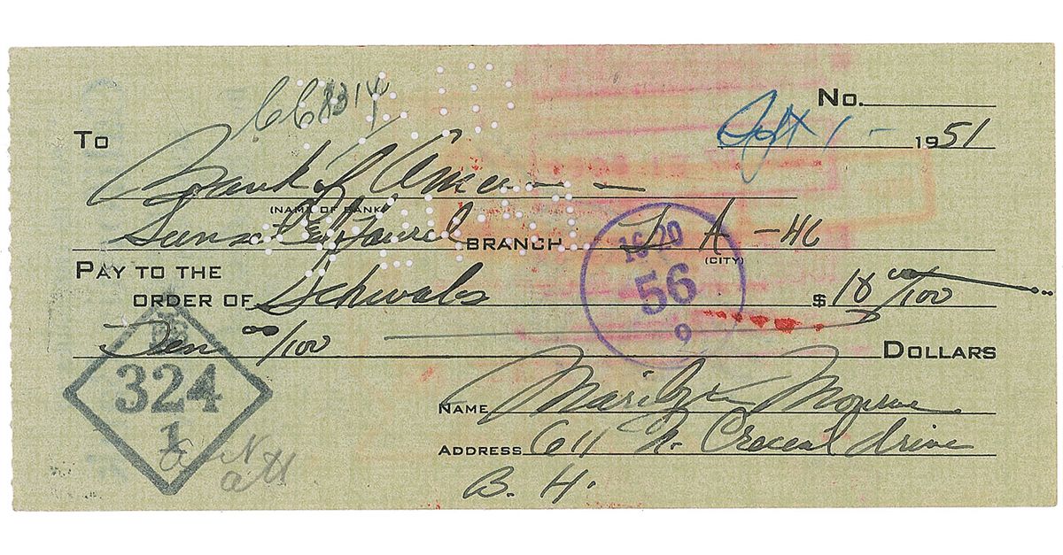 Bank check, 6 x 2.75, filled out and signed by Monroe, payable to Schwabs for $10, September 1, 1951. Monroe has added her bank information at the top, “Bank of America, Sunset & Laurel,” as well as her address at the bottom, “611 N. Crescent Drive.” In fine condition, with expected cancellation holes and bank stamps (affecting some portions of her writing but not the gorgeous signature). Schwab's Pharmacy was a gathering place for Hollywood’s movers and shakers—Judy Garland, Orson Welles, F. Scott Fitzgerald, Clark Gable, and the Marx Brothers were among those known to frequent the establishment. Young hopefuls also converged on the drug store, hoping to rub shoulders with these celebrities and catch their ‘big break’—and Monroe was no exception. According to The Unabridged Marilyn (1987), she was lunching there in 1949 when she learned about auditions for a bit part in the Marx Brothers comedy Love Happy—a role she won. The exceptional association and choice condition make this one of the most remarkable Monroe checks we have offered.