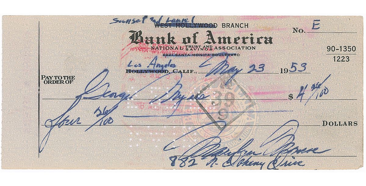 Bank check, 7 x 3, filled out and signed by Monroe, “Marilyn Monroe,” payable to George Myers for $4.26, May 23, 1953. Monroe also wrote her address at the bottom, “882 N. Doheny Drive.” In fine condition, with expected bank stamps and cancellation holes (hardly affecting the writing or signature), and some slight spreading to ink in a couple areas. Monroe lived in apartment #3 at this Doheny Drive address from 1953 through January 1954, when she married Joe DiMaggio; she returned to the same apartment in 1961, following her divorce from Arthur Miller.