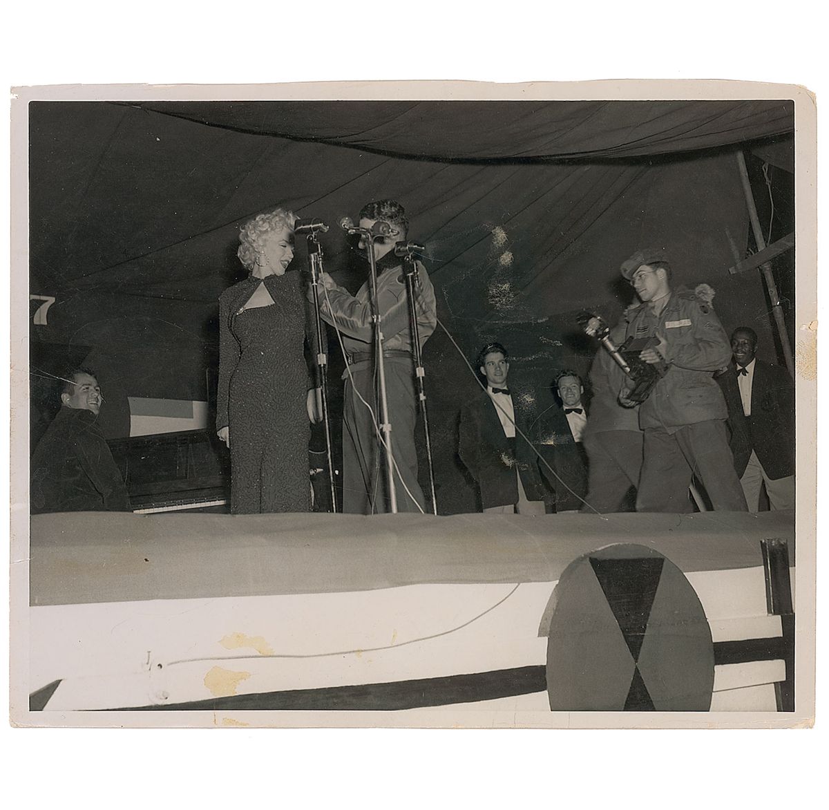 Original glossy 10 x 8 photo of Monroe in her famous sparkling cocktail dress entertaining troops in 1954, with one person adjusting something on her left shoulder, and corporal Joseph Fishman to the right side with a large camera. On the reverse, Fishman has written, “Thats me working! Korea, Feb. 1954.” In very good condition, with overall bends and creases, moderate scattered surface marks, and lightly trimmed edges. At the time, Monroe and Joe DiMaggio were on their honeymoon in Japan, and she took a detour to Korea to boost troop morale. An unusually large, likely unpublished candid photo from one of her important shows for the troops.