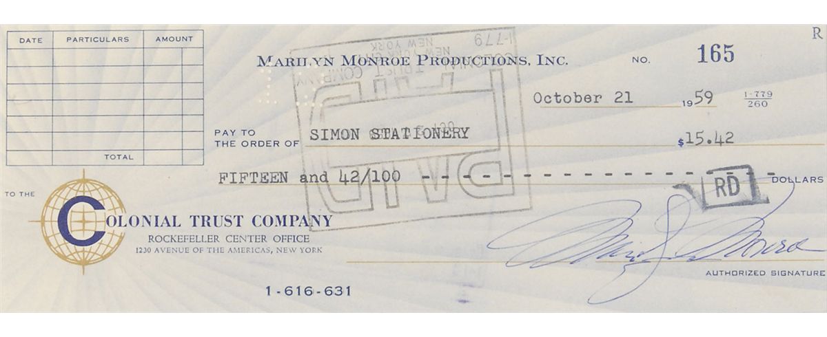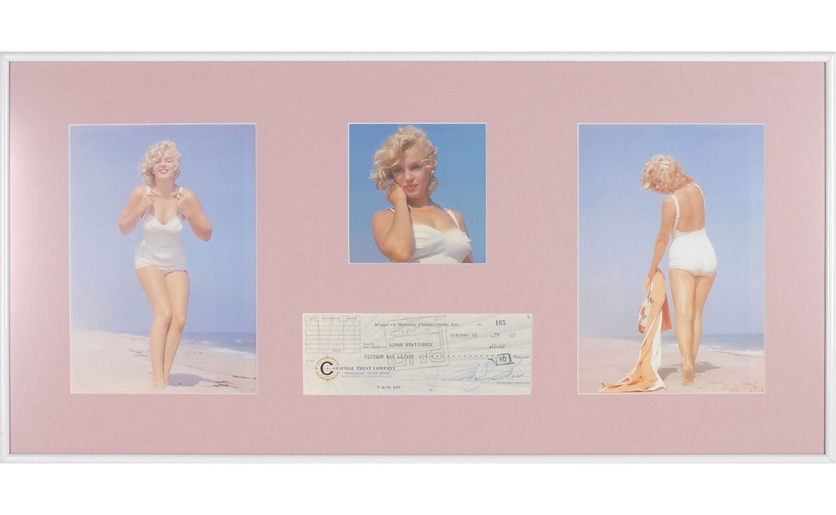 Marilyn Monroe Productions, Inc. business check, 8 x 3, filled out in type and signed by Monroe, payable to Simon Stationery for $15.42, October 21, 1959. Matted and framed with three color photos of Marilyn at the beach to an overall size of 30.5 x 15. In fine condition, with cancellation holes and stamps to body, one touching a single stroke of the signature. Oversized.