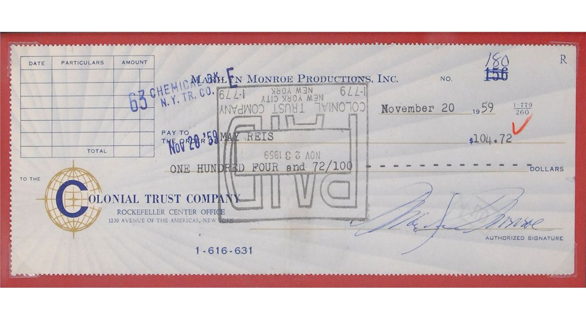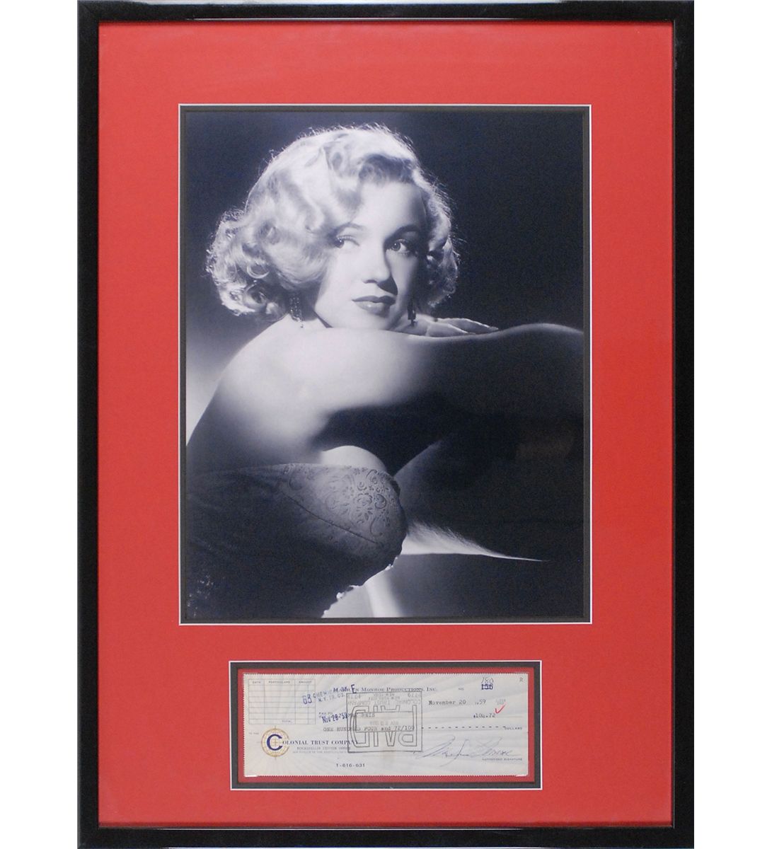 Marilyn Monroe Productions, Inc., business check, 8.25 x 3, filled out in type and signed by Monroe, payable to May Reis for $104.72, November 20, 1959. Attractively double-matted and framed with a portrait of Monroe to an overall size of 18 x 25. In fine condition, with a central vertical fold and expected bank stamps (one very light stamp to the first letter of her last name. May Reis was Monroe’s longtime personal secretary and one of the beneficiaries named in her will. At the time she wrote this check, Marilyn was between projects—the classic Some Like It Hot had been released earlier in the year, and she would begin shooting Let's Make Love in early 1960. Oversized.