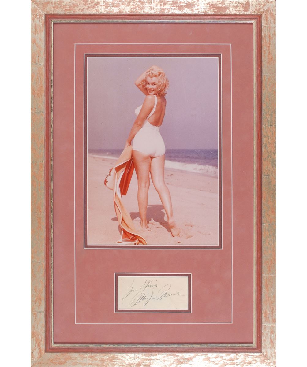 Sought-after pencil signature, “Love & Kisses, Marilyn Monroe,” on an off-white 5 x 2.5 slip. Wonderfully triple-suede-matted and framed to an overall size of 18 x 27. In very good condition, with intersecting folds passing through several letters of her signature, light creases, and a few stray pencil marks. A bold and instantly displayable example from Hollywood’s legendary starlet. Oversized.