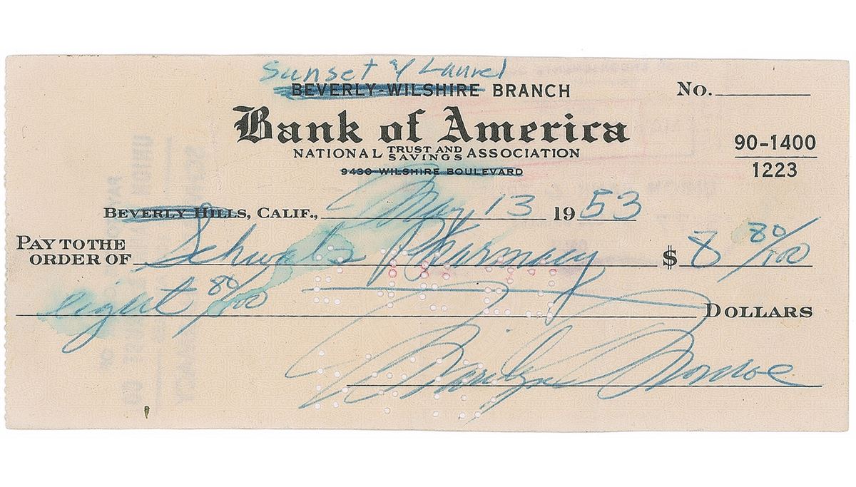 Bank check, 6 x 2.75, filled out and signed by Monroe, payable to Schwab’s Pharmacy for $8.80, May 13, 1953. In very good condition, with expected cancellation holes (affecting portions of her first name) and dampstaining with some bleeding to ink in the body of the check. Schwab’s Pharmacy was a gathering place for Hollywood’s movers and shakers; Judy Garland, Orson Welles, Clark Gable, and the Marx Brothers were among those known to frequent the establishment. Young hopefuls also converged on the drug store for the chance to rub shoulders with these celebrities and catch their ‘big break’—and Monroe was no exception. According to The Unabridged Marilyn (1987), she was lunching there in 1949 when she learned about auditions for a bit part in the Marx Brothers comedy Love Happy, a role she went on to book. Around the time of this check Monroe had begun dating Joe DiMaggio, and two of her greatest films—How to Marry a Millionaire and Gentlemen Prefer Blondes—were released in 1953.